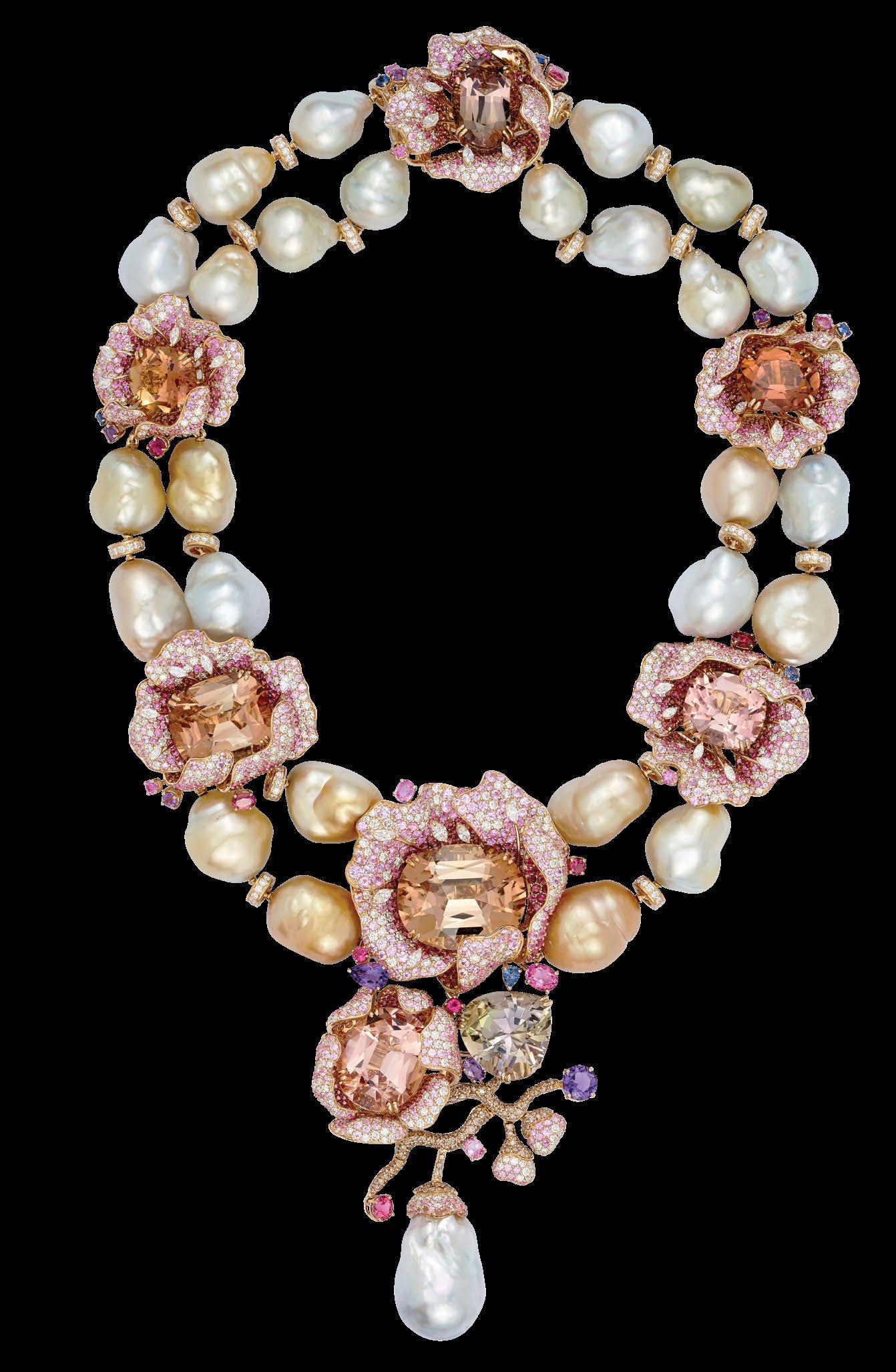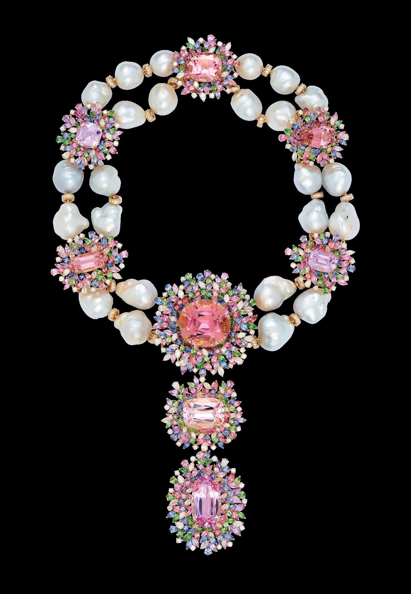 Collier created with gemstones of significant size including pink tourmaline (104.94ct), kunzite (57.40ct) and morganite (38.58ct), along with an exceptional assemblage of twenty-four large Australian South Sea baroque pearls measuring 16.5-23.5mm. The piece is further enhanced with three pink tourmalines (62 73ct) and two kunzites (34.21ct), with diamonds, blue sapphires, pink sapphires, purple sapphires, tsavorites and pink tourmalines.