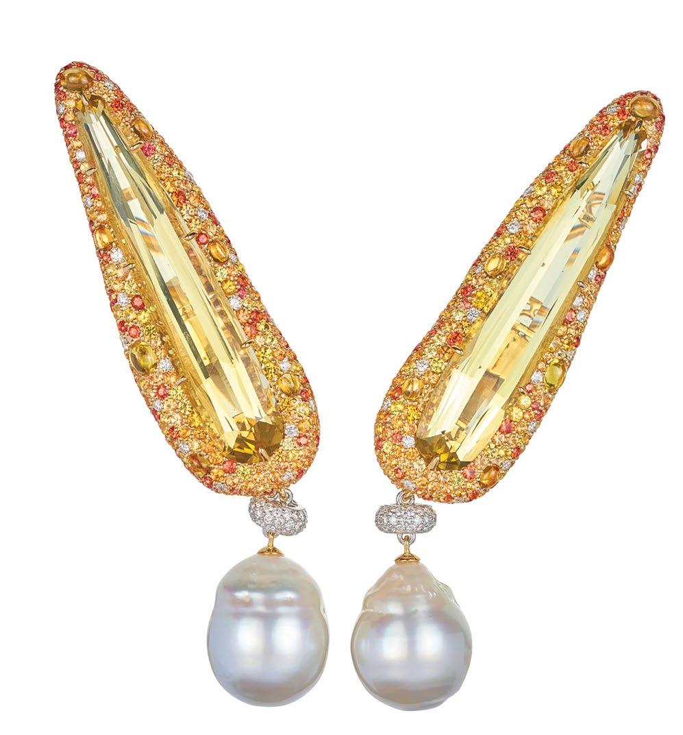 Earrings featuring yellow beryls (58.52ct), diamonds, yellow sapphires, orange sapphires and Australian South Sea baroque pearl drops. Crafted in 18-karat yellow and white gold.