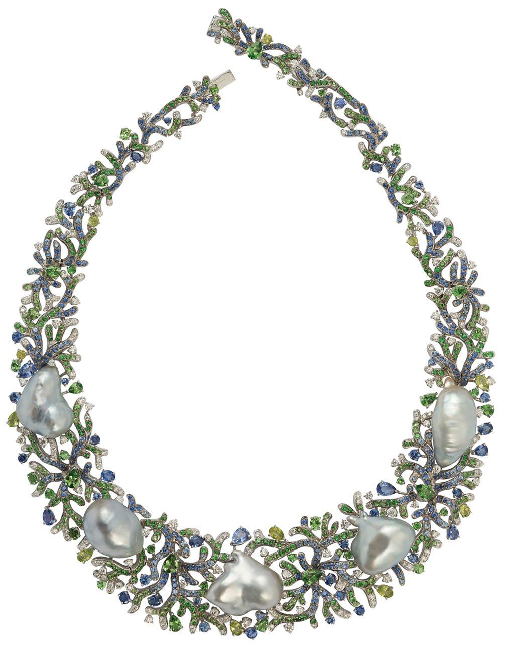 Collier featuring Australian South Sea baroque pearls, diamonds, blue sapphires, tsavorites and peridots.