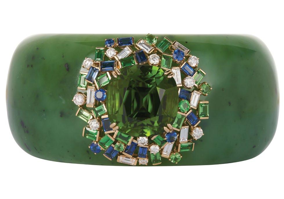Cuff featuring green tourmaline (40.82ct), nephrite (1,096.65ct), diamonds, tsavorites and blue sapphires.
