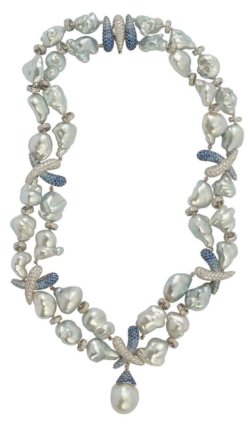 Necklace featuring Australian South Sea baroque pearls, diamonds and blue sapphires. Crafted in 18-karat white gold. 26cm x 16.5cm