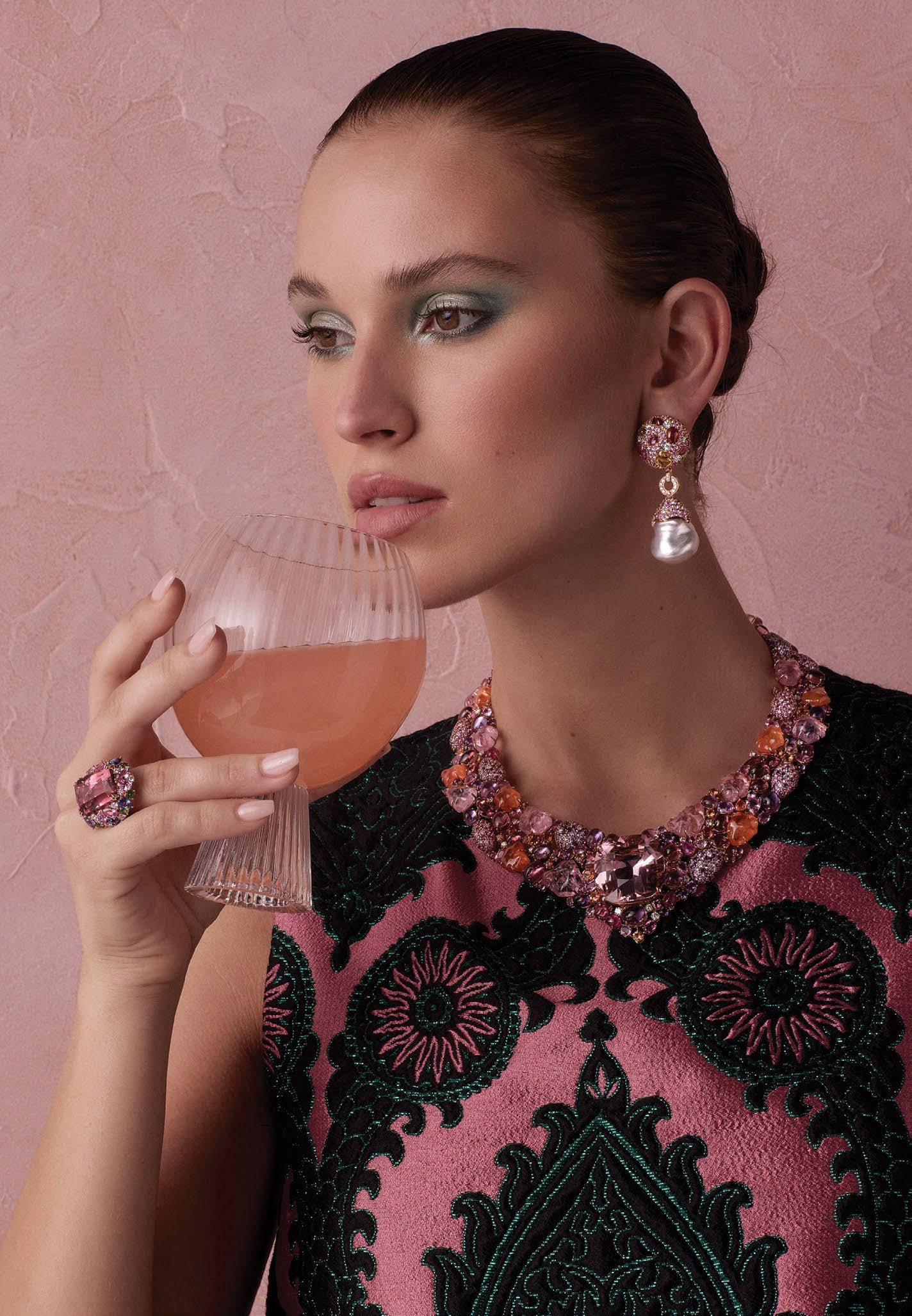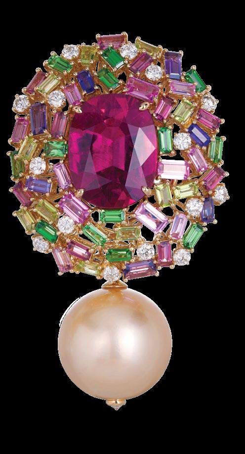 Earrings featuring green tourmaline (6.23ct), pink tourmaline (6.57ct), Australian South Sea pearls, diamonds, pink sapphires, purple sapphires, amethysts, rose de France, pink tourmalines and tsavorites.