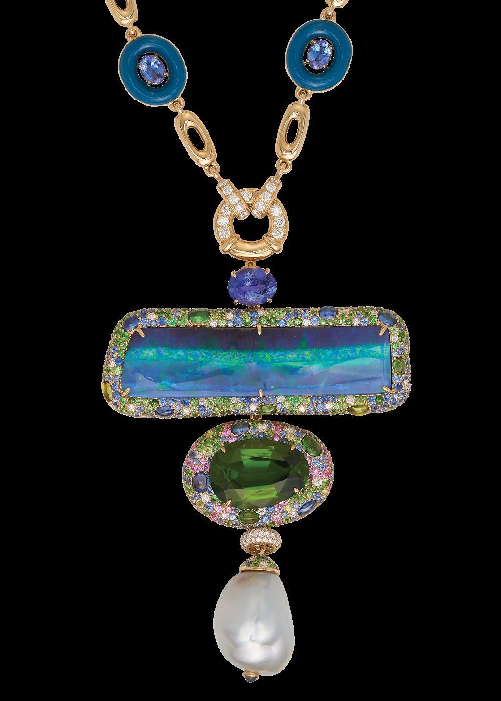 Necklace featuring Australian black boulder opal (87 41ct), peridot (38.40ct), Australian South Sea baroque pearl, diamonds, blue sapphires, pink sapphires, tsavorites, peridots, tanzanites and blue enamel. Crafted in 18-karat yellow gold. 36cm x 17cm