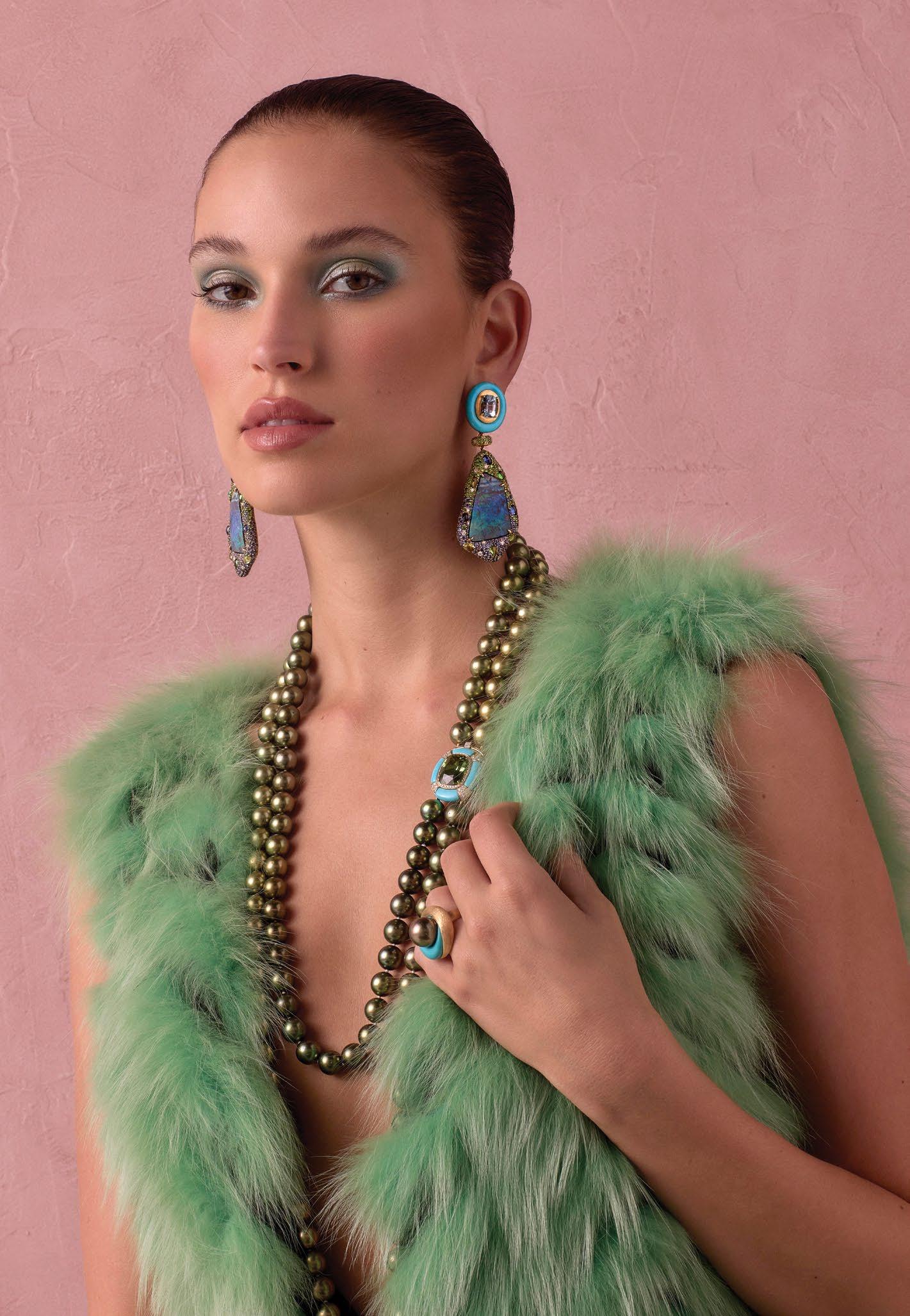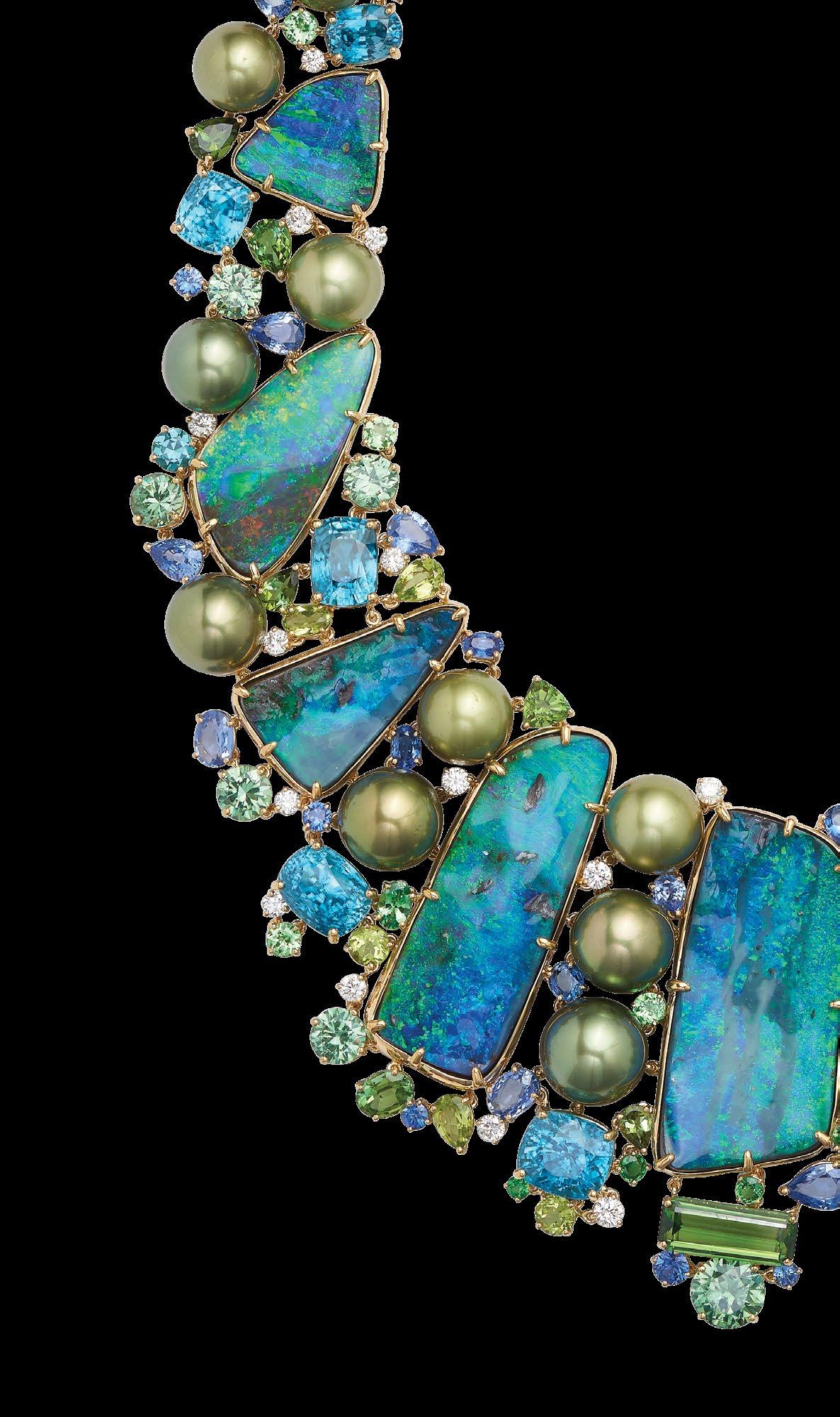 Collier featuring Australian boulder opals (38.35ct), pistachio pearls, diamonds, blue zircons, yellow beryls, Paraiba tourmalines, demantoids, green tourmalines, blue sapphires, tanzanites, tsavorites and peridots.