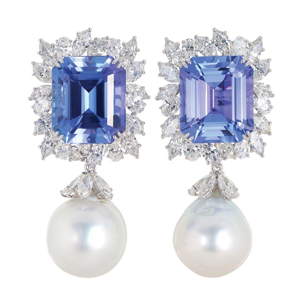 Earrings featuring tanzanites (70.53ct), diamonds, and Australian South Sea pearl drops. Crafted in 18-karat white gold. 6cm x 2.9cm