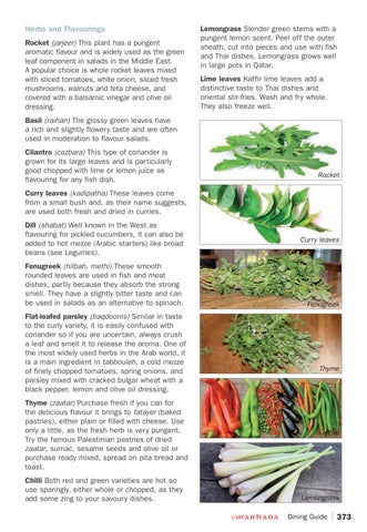 Lemongrass Slender green stems with a pungent lemon scent. Peel off the outer sheath, cut into pieces and use with fish and Thai dishes. Lemongrass grows well in large pots in Qatar. Lime leaves Kaffir lime leaves add a distinctive taste to Thai dishes and oriental stir-fries. Wash and fry whole. They also freeze well.