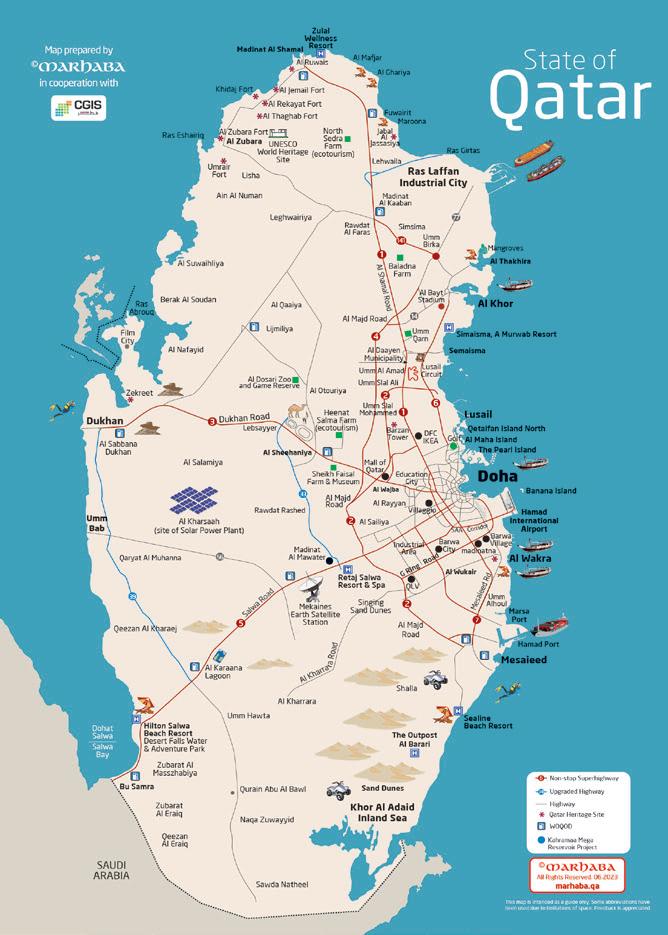 M87 AUTUMN 2023 © MARHABA 14 Al Majd Road 1 3 6 2 2 2 5 4 1 14 7 56 33 39 141 77 Simaisma, A Murwab Resort Al Bayt Stadium Umm Qarn Al Daayen Municipality Al Shamal Road Al Ruwais Al Mafjar Zulal Wellness Resort Al Ghariya Fuwairit Maroona Ras Girtas Madinat Al Kaaban Rawdat Al Faras Simsima Umm Birka Ras Laffan Industrial City Al Thakhira Al Khor Lusail Jabal Al Jassasiya State of Qatar Lehwaila Madinat Al Shamal Semaisma Lijmiliya Al Qaaiya Umm Al Amad Umm Slal Ali Al Dosari Zoo and Game Reserve Al Otouriya Umm Slal Mohammed Lusail Circuit Barzan Tower Mall of Qatar Sheikh Faisal Farm & Museum Rawdat Rashed Education City Al Rayyan Villaggio Al Sailiya Industrial Area Barwa City QLV Mesaieed Rd Al Wajba DFC IKEA Golf Al RoadMajd Madinat Al Mawater Qaryat Al Muhanna Al Kharsaah (site of Solar Power Plant) Al Salamiya Al Sabbana Dukhan Zekreet Al Nafayid Film City Ras Abrouq Berak Al Soudan Al Suwaihliya Leghwairiya Ain Al Numan Lisha Umrair Fort Khidaj Fort Al Zubara Fort Al Jemail Fort Al Rekayat Fort Al Thaghab Fort UNESCO World Heritage Site North Sedra Farm (ecotourism) Baladna Farm Heenat Salma Farm (ecotourism) Ras Eshairiq Al Zubara Umm Bab Dukhan Al Sheehaniya The Pearl Island Banana Island Al Maha Island Barwa Village Hamad International Airport Al Wukair Marsa Port Hamad Port GRIng Road Al Wakra Mesaieed Sealine Beach Resort The Outpost Al Barari Retaj Salwa Resort & Spa Sand Dunes Khor Al Adaid Inland