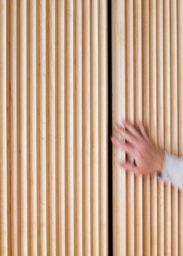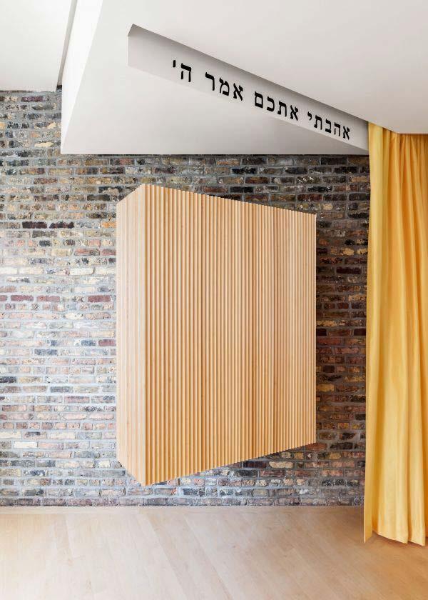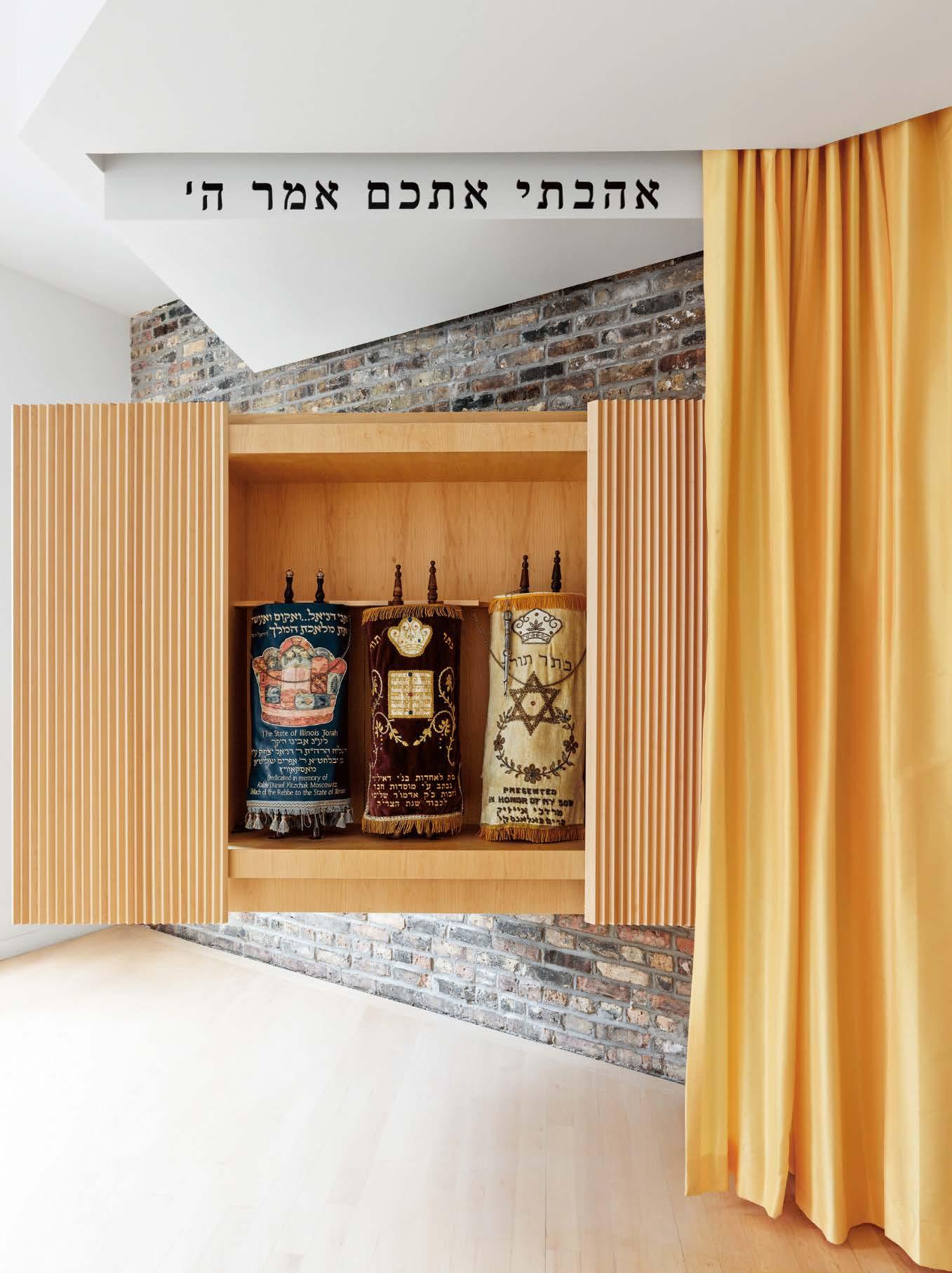 Attention to detail is particularly pronounced in the design of the Torah Ark, which houses the Torah scrolls. Its facade is adorned with triangular wooden members, meticulously arranged to achieve a textured surface and dynamic interplay of light and shadow. The design of the Torah Ark features sliding doors that gracefully open to the sides, facilitating the seamless movement of individuals during ceremonial proceedings. Positioned at an angle amidst existing drapery and the back wall, thorough planning ensures a harmonious integration within the spatial context, supported by a custom-designed metal plate to securely affix the heavy structure.