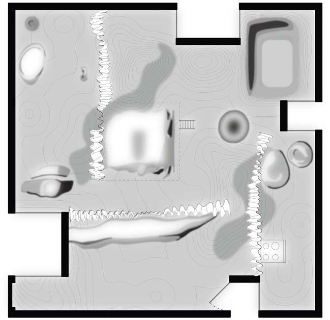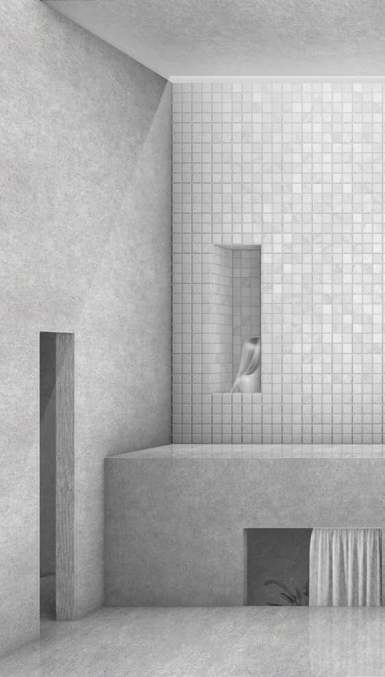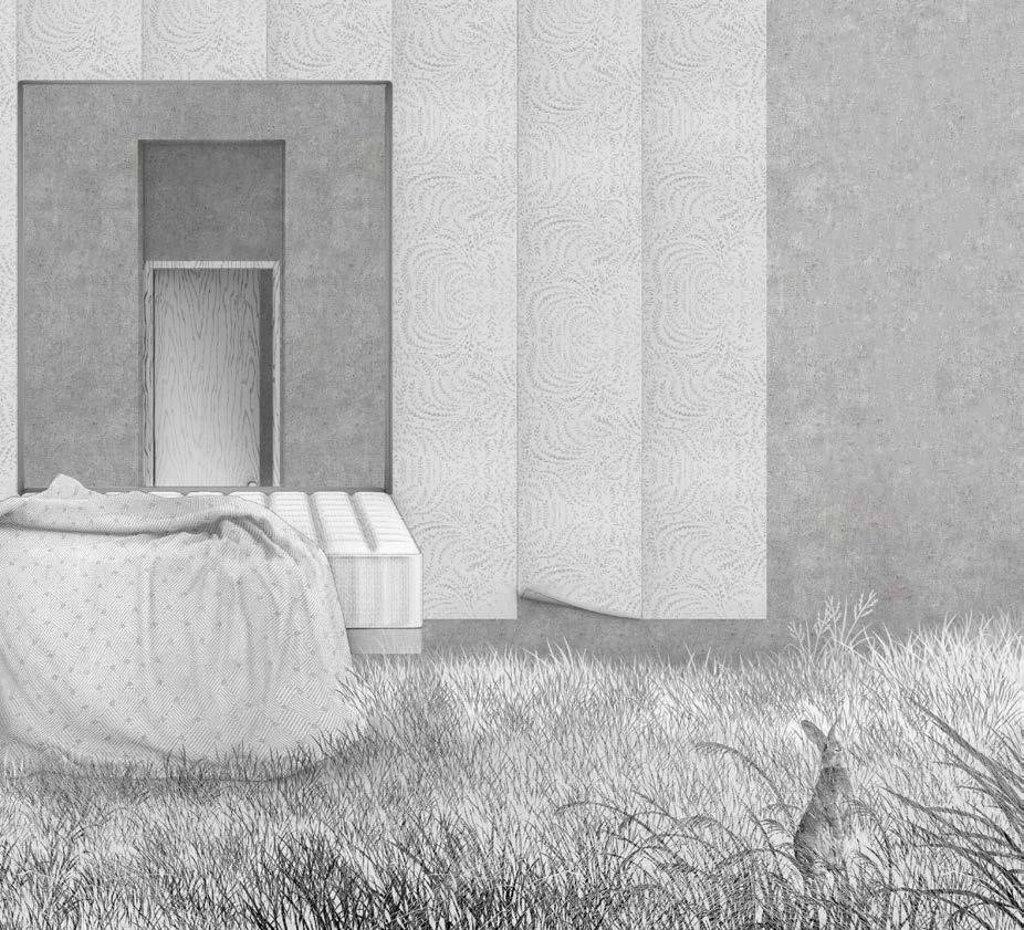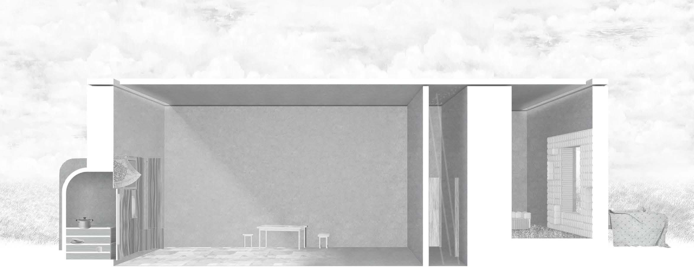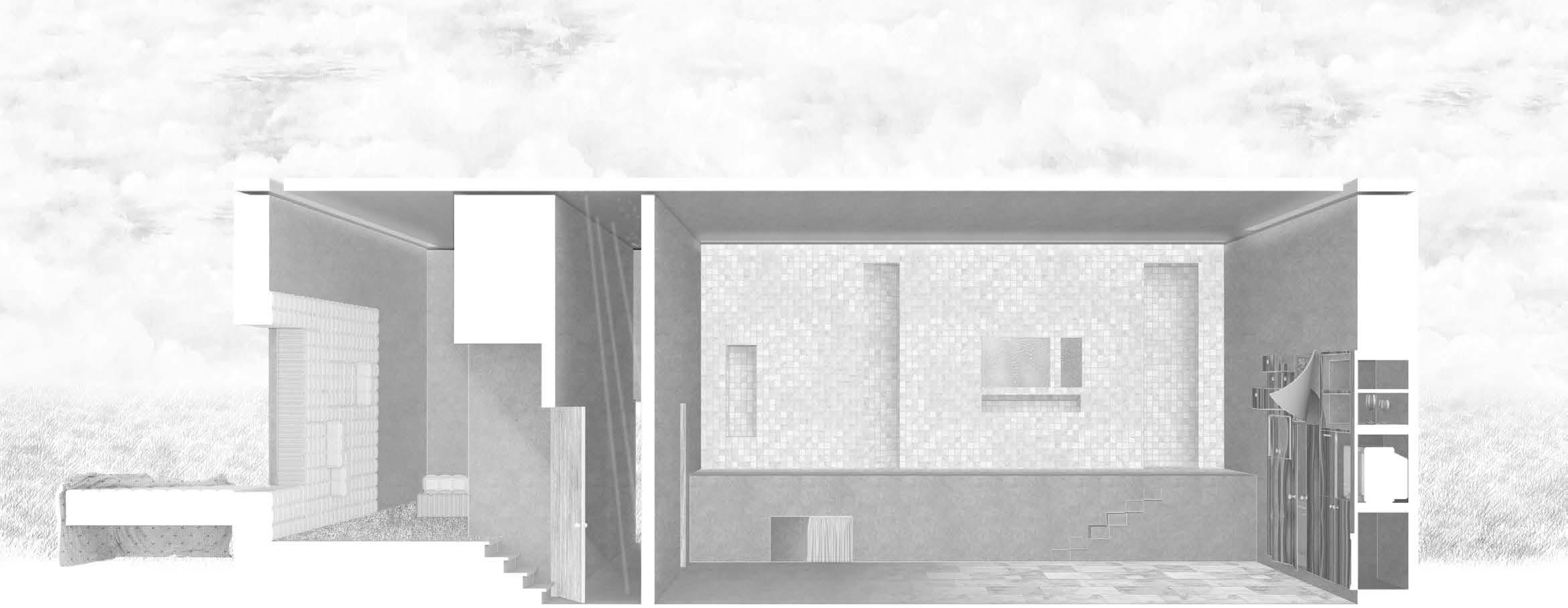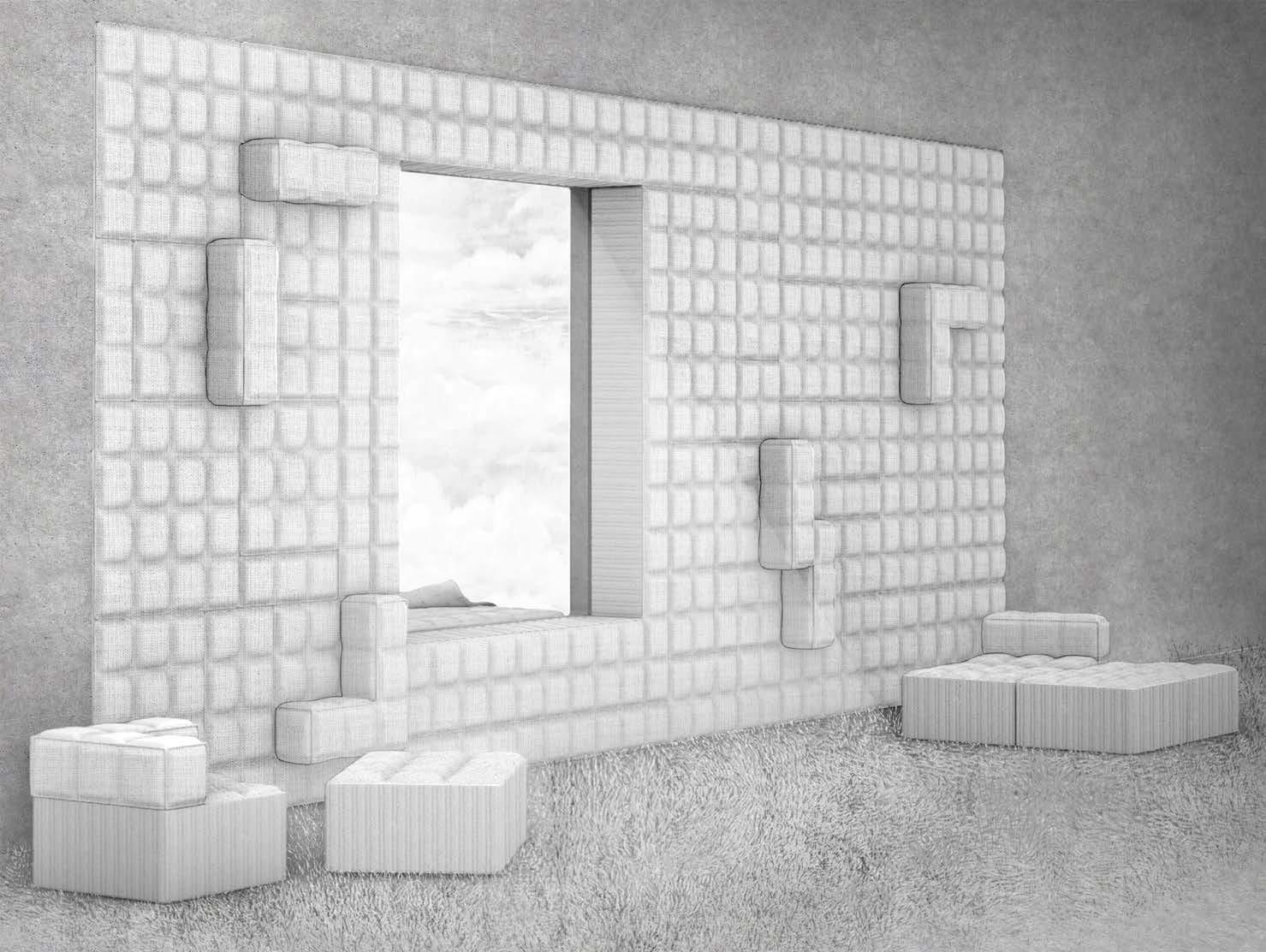 usage, the bed bathes the adjoining living room in natural light, while the plush carpeting evokes the sensation of grass underfoot. The design strategy of the living room invites inhabitants to rearrange the soft cushioned elements that form the wall if needed. The bathroom facilities are discreetly concealed behind a tile-patterned wall, offering glimpses of dynamic human presence while safeguarding privacy.