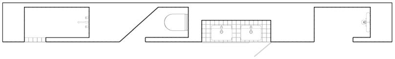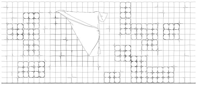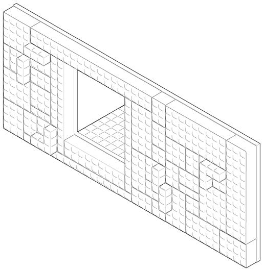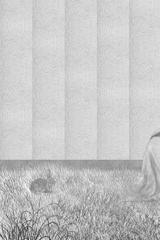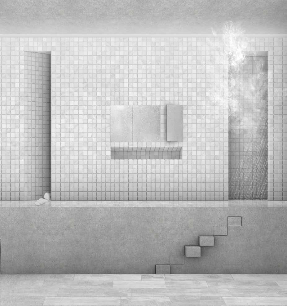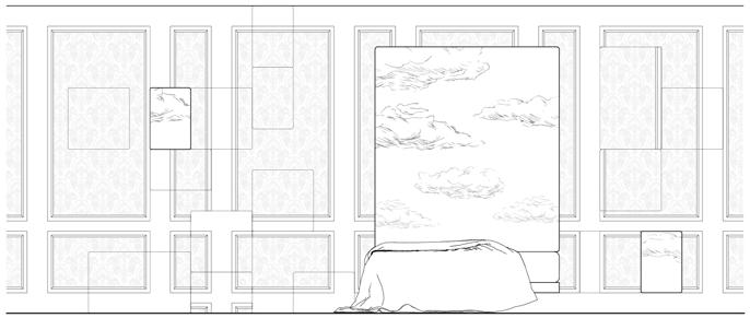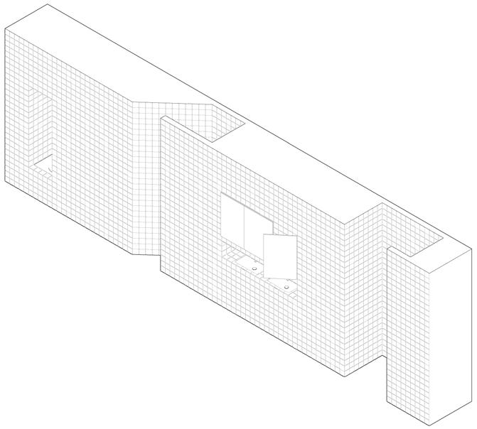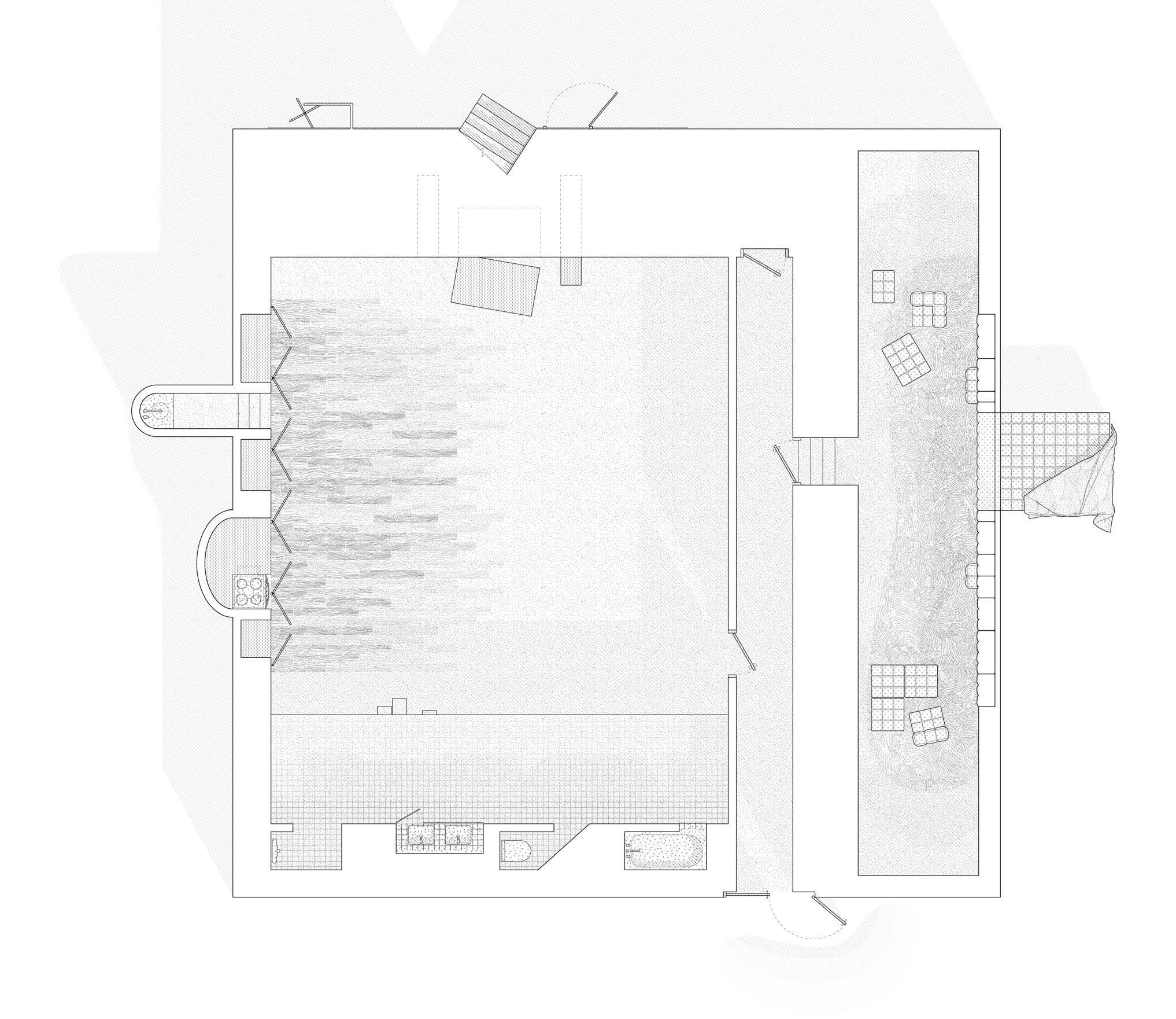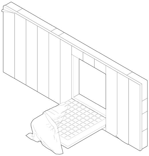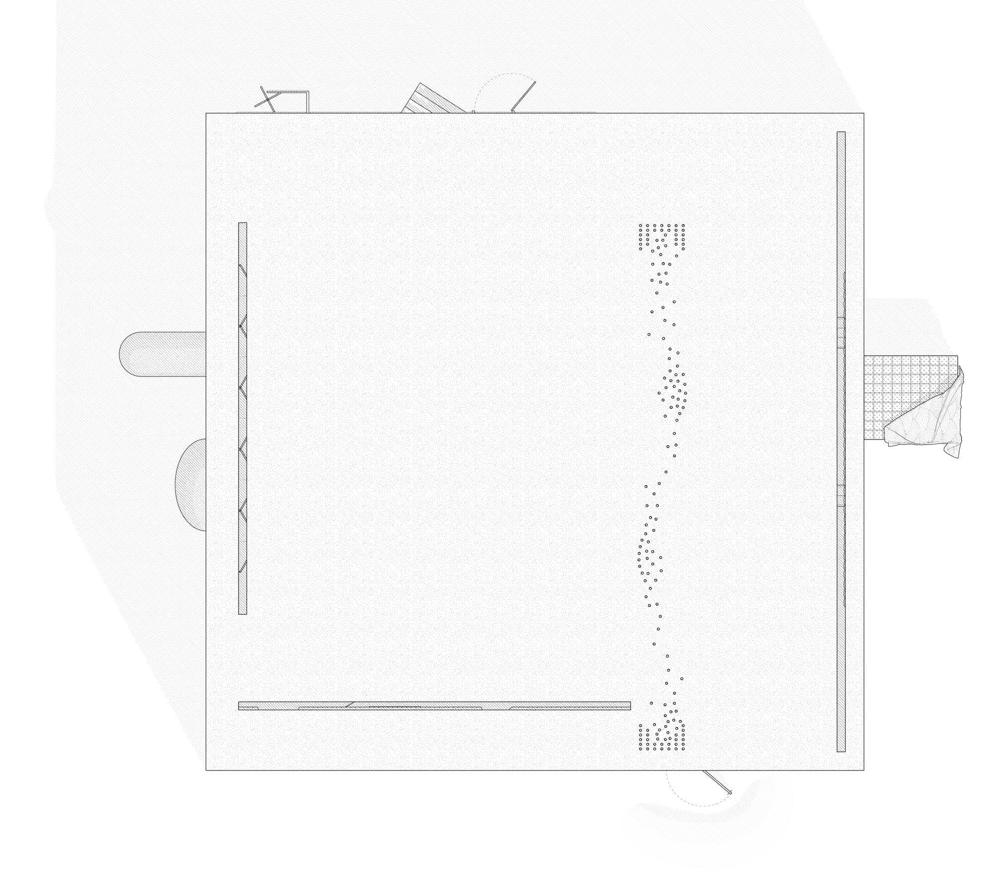 usage, the bed bathes the adjoining living room in natural light, while the plush carpeting evokes the sensation of grass underfoot. The design strategy of the living room invites inhabitants to rearrange the soft cushioned elements that form the wall if needed. The bathroom facilities are discreetly concealed behind a tile-patterned wall, offering glimpses of dynamic human presence while safeguarding privacy.
