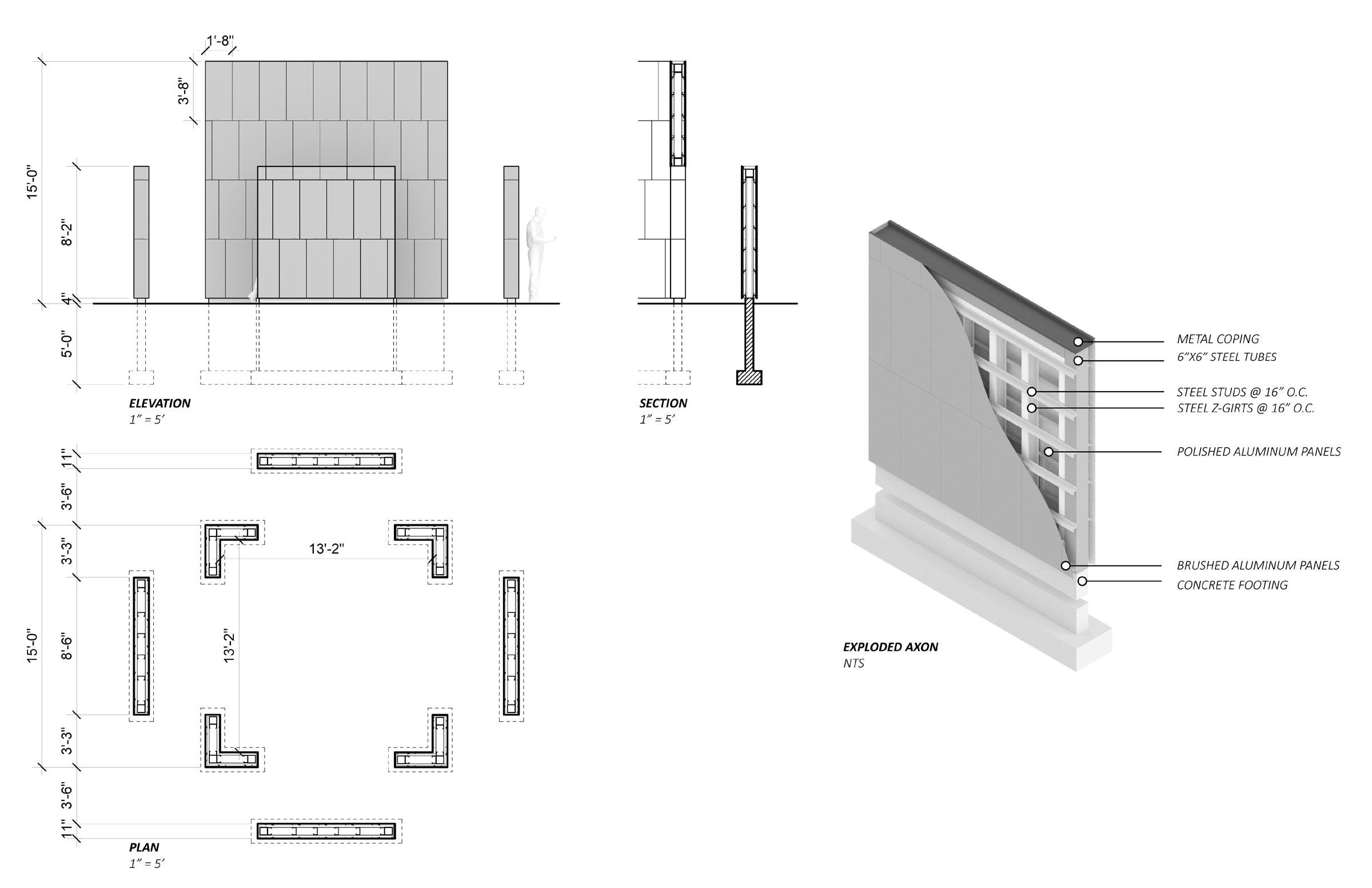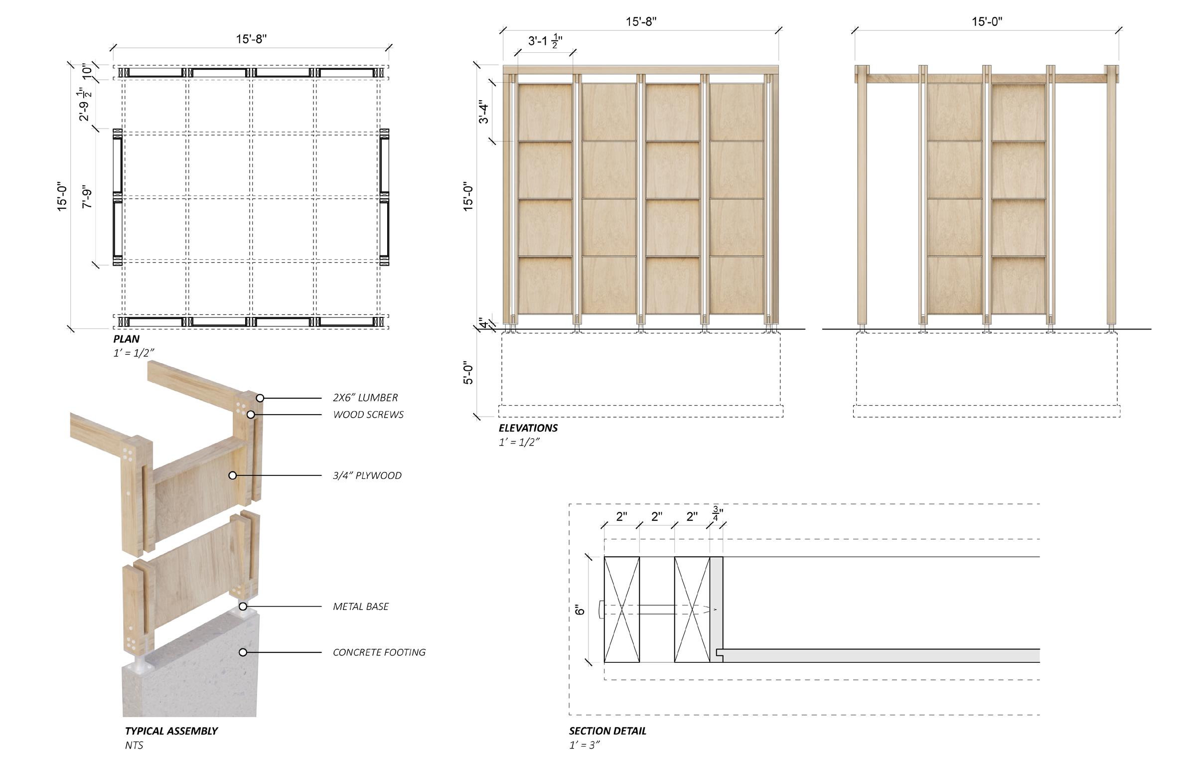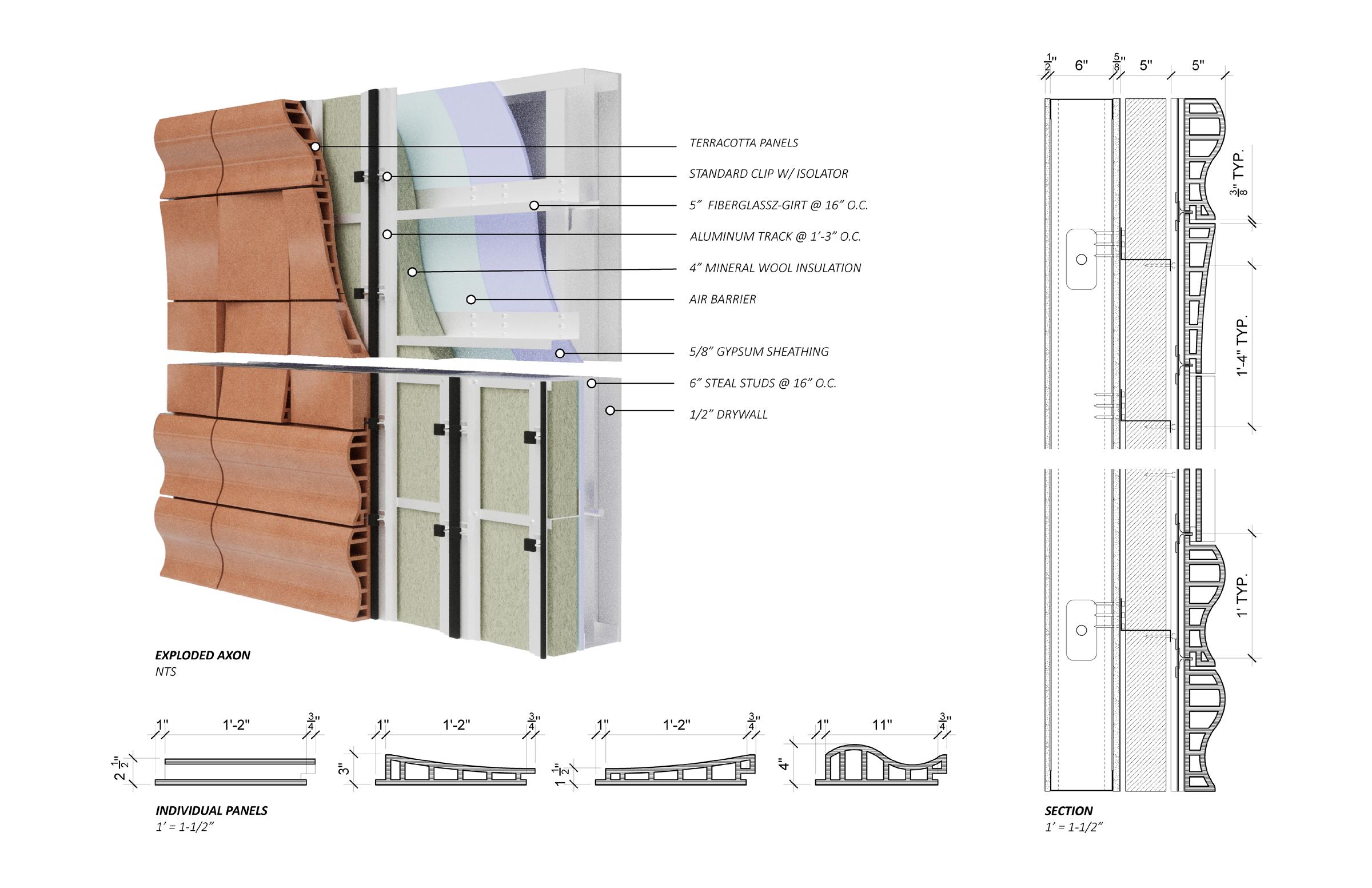 The subsequent documentation outlines a selected series of thorough material and assembly investigations undertaken within the scope of the Facade Design & Construction Class. Each study encompasses either a one-to-one mock-up or a compact pavilion confined within dimensions of 15x15x15 feet. The semester-long explorations encompass a diverse array of materials, including stone, brick, terracotta, glass, metal, wood, and concrete.