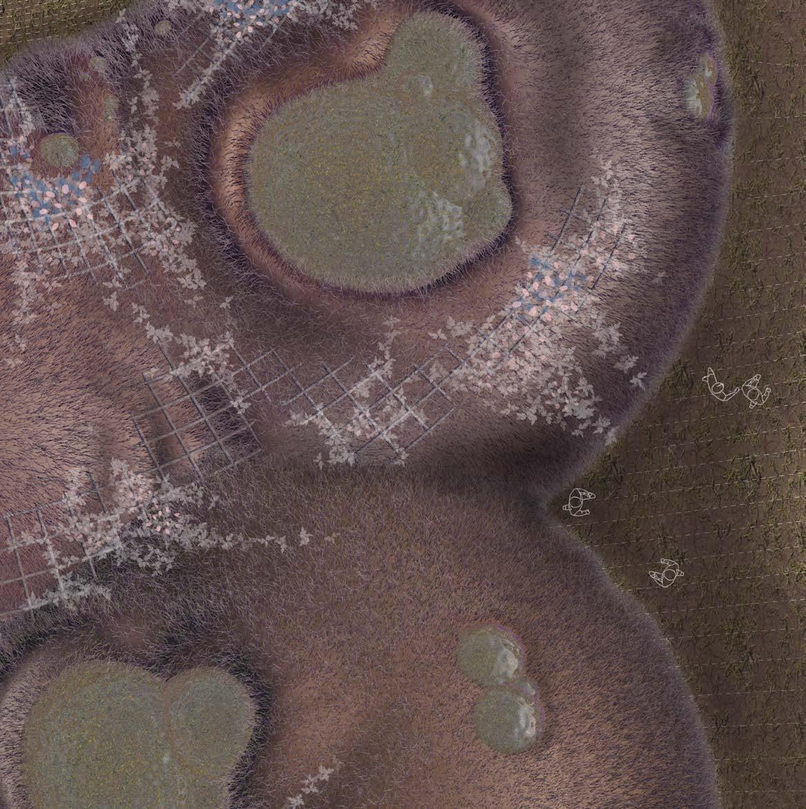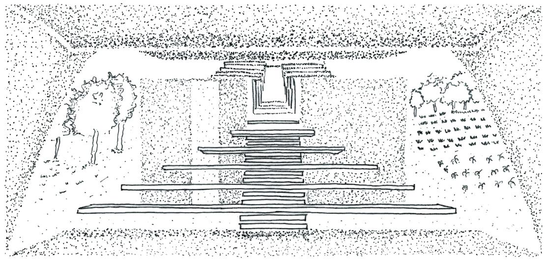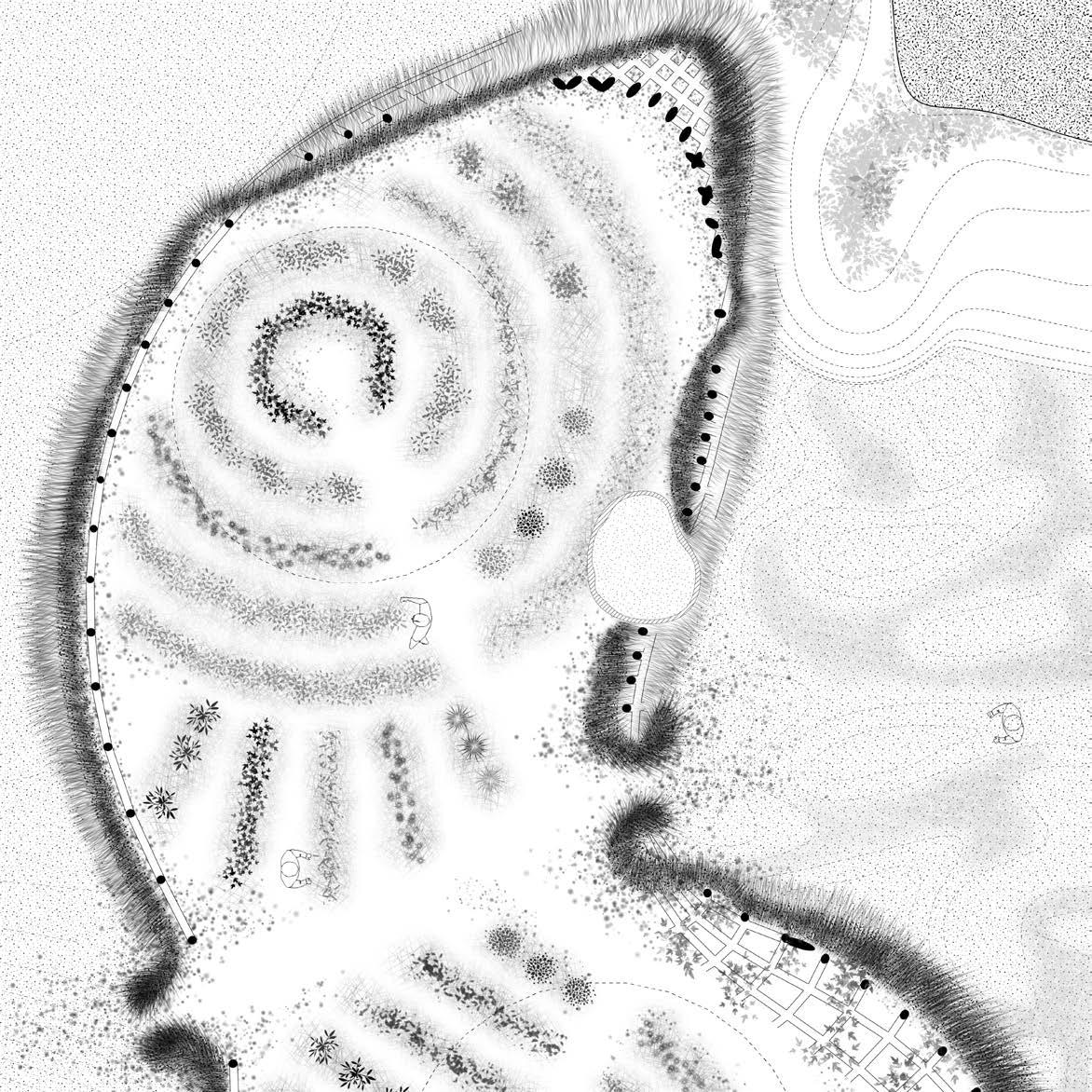 Encircling the site’s perimeter are elevated mounds that create and maintain an ambiance distinct from the surrounding urban environment, occasionally tapering to suggest points of ingress. A cohesive narrative emerges through the gradual mor-