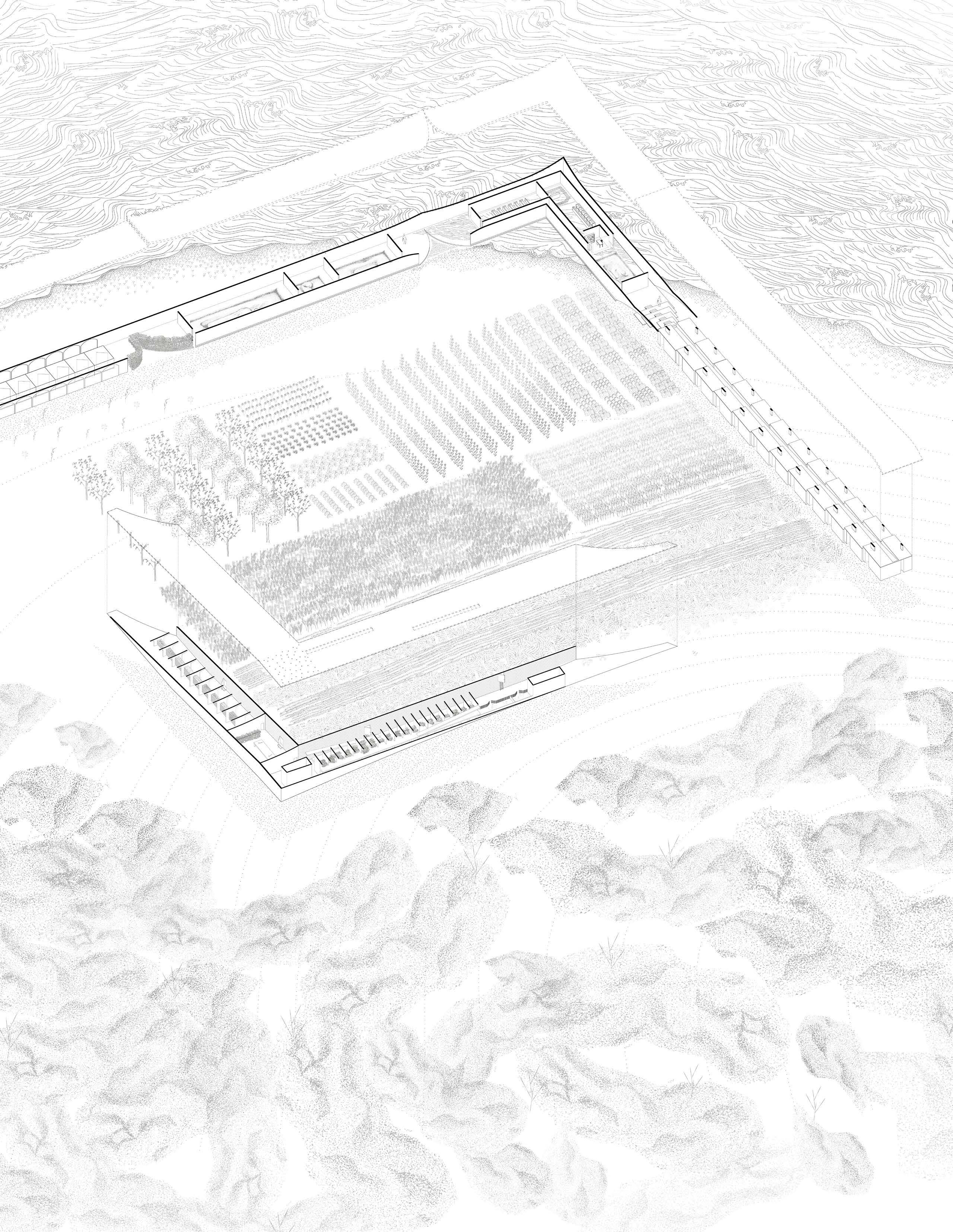 The interiors are characterized by contained ecosystems, ranging from meticulously managed to untamed environments. The project idealizes rural existence and evokes nostalgia for nurturing nature. Livestock and wildlife coexist harmoniously, seamlessly integrated into the architectural volumes and natural surroundings, grazing freely without the encumbrance of typical farming detritus.