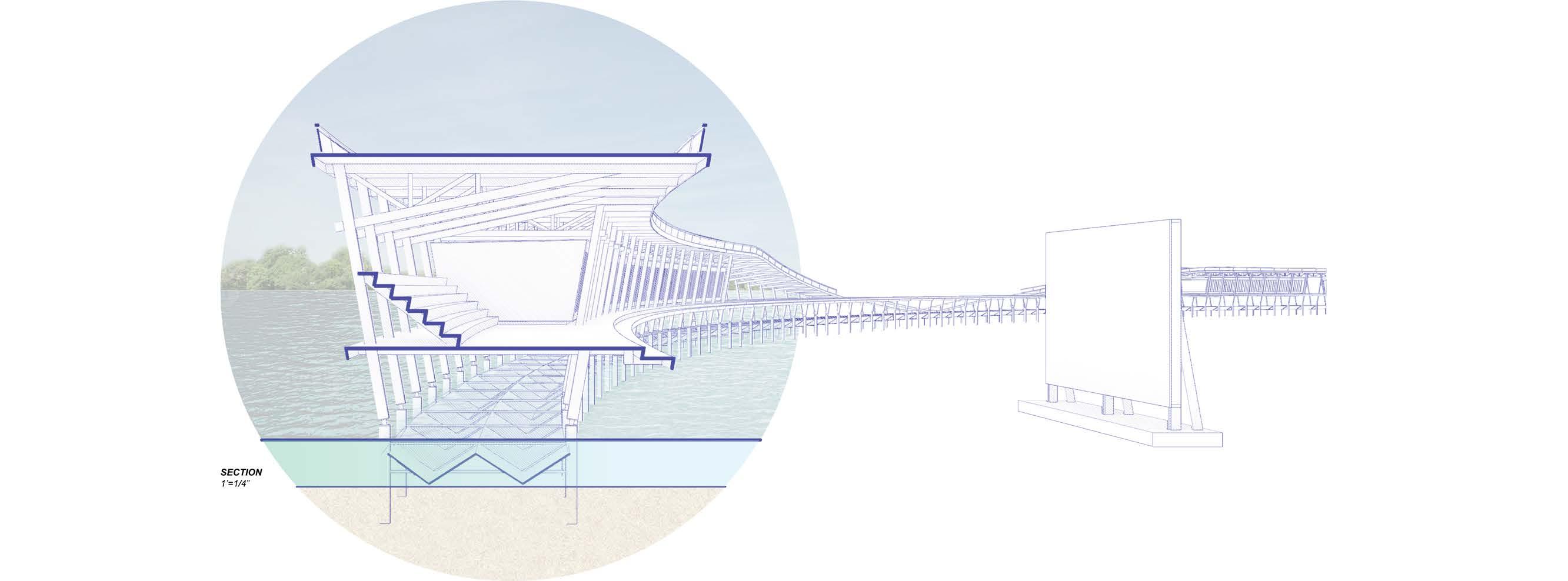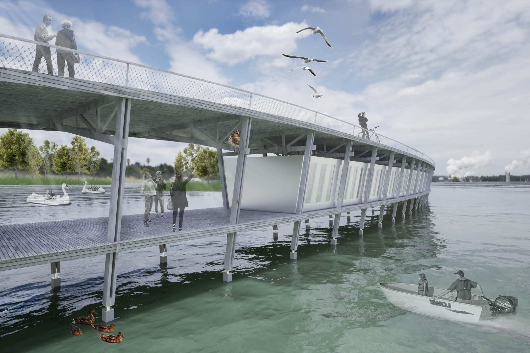 At its core, the Pig’s Eye Lake Wetland Bird Sanctuary materializes as a circular wooden dock, spanning a halfmile diameter. Beneath the water’s surface, it accommodates a fingernail mussel habitat, connected to a rigid mesh structure. This not only promotes biodiversity but also serves to