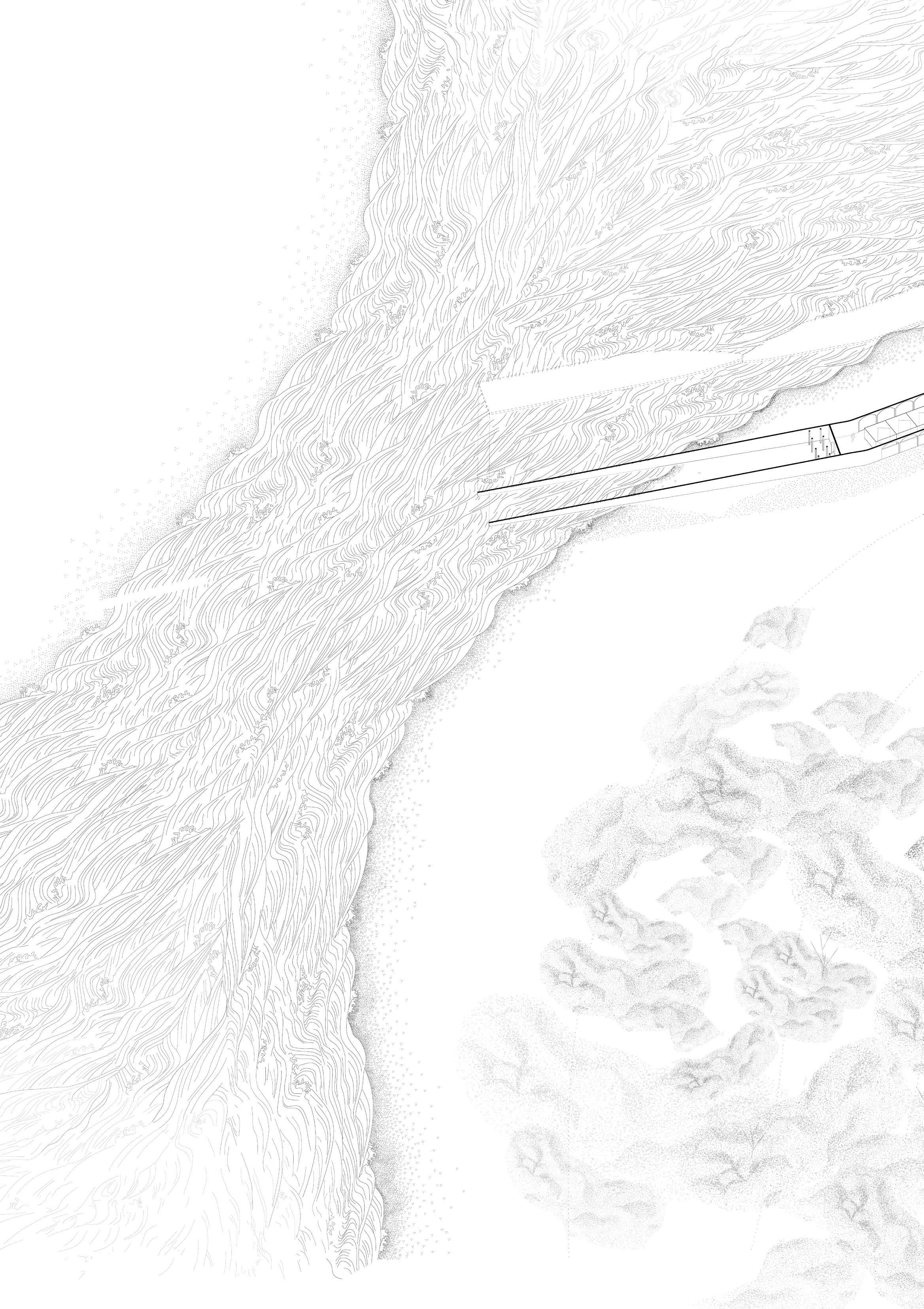 The project comprises a monastery situated on a remote island, characterized by its linear arrangement symbolizing the journey towards monkhood. The monastery’s walls impart a sensation of floating by maintaining a deliberate gap, enabling natural light to permeate from below. Similarly, the roof is ‘detached’ from the walls and selectively peeled away to facilitate the circulation of light, air, and water.