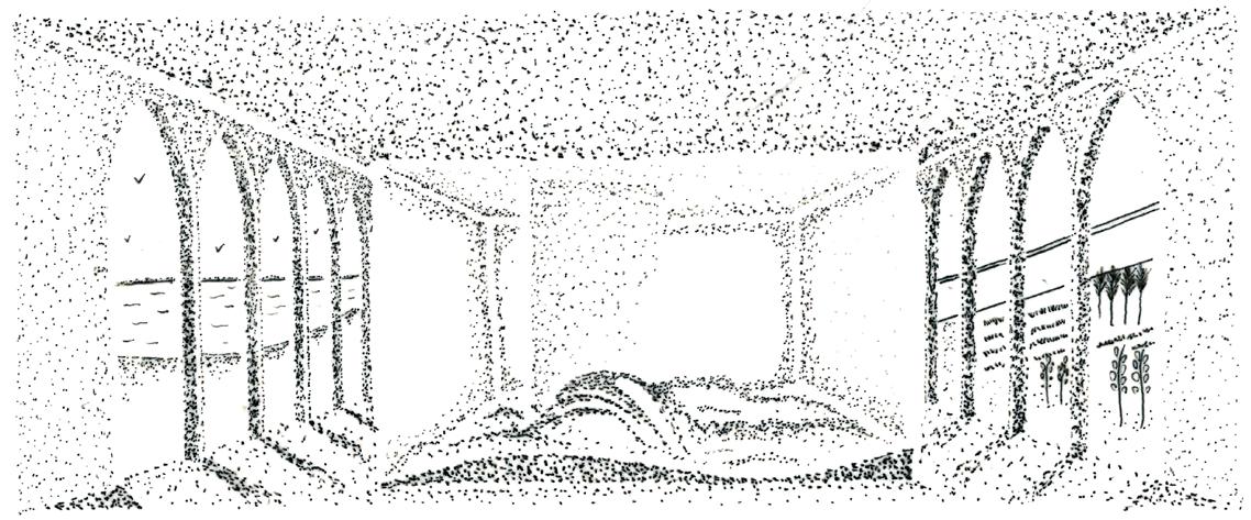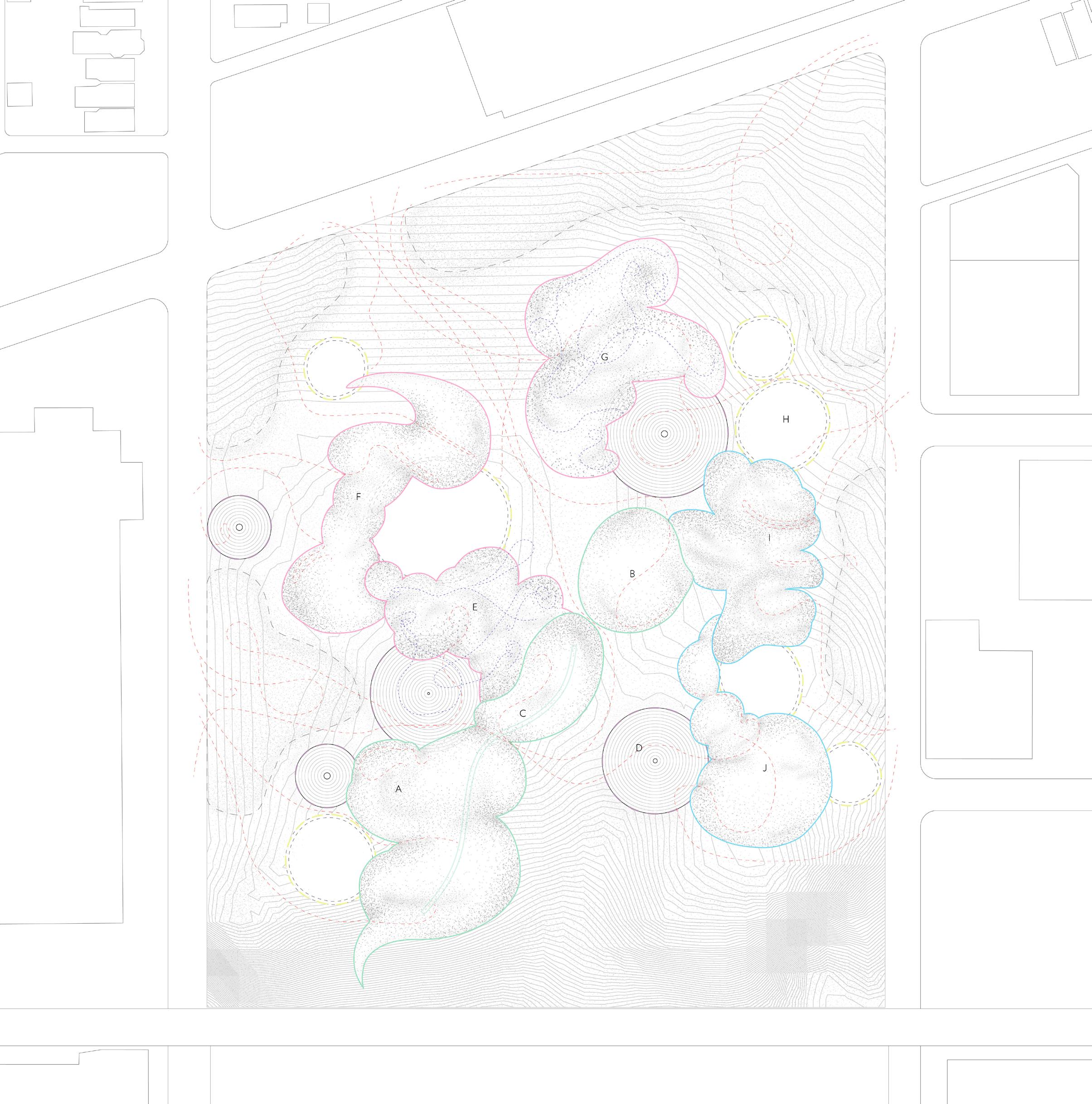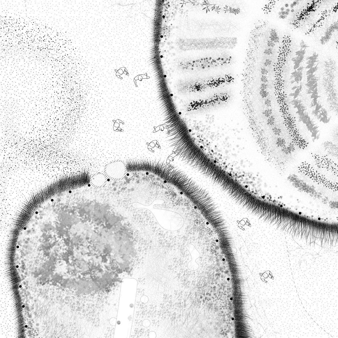 Resembling livestock, “Sleepy Bowel” comprises a series of morphological structures nestled snugly within the terrain and atop one another. Its primary aim is to attract a diverse audience, fostering active engagement with the landscape’s profoundly atmospheric spaces through the integration of light, water, natural elements, and organic material. The program consists of various greenhouses, animal and plant farms, rain gardens, and leisure spaces. The design intends to evoke a range of human emotions and stimulate various sensory receptors.