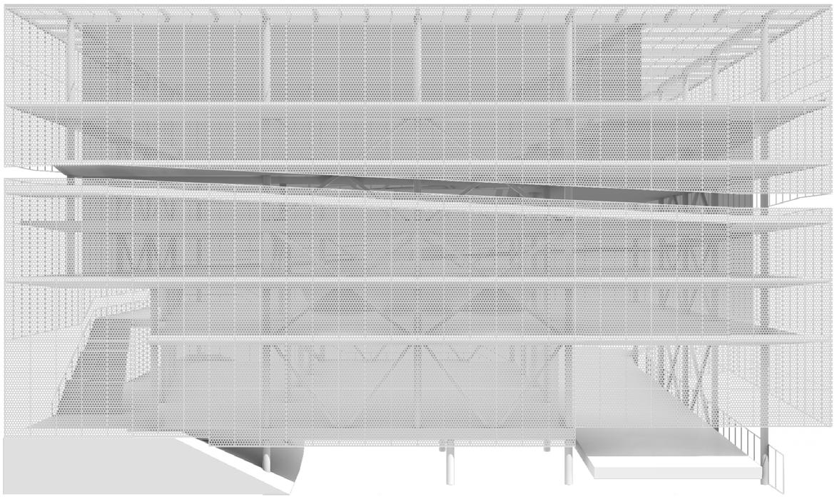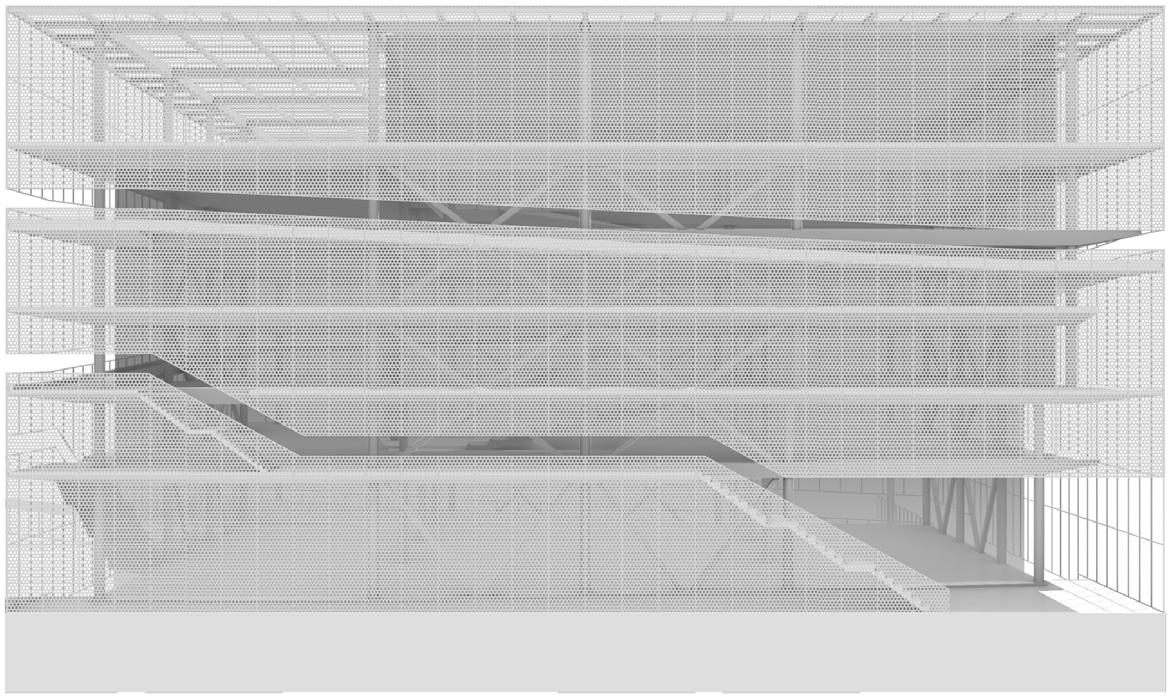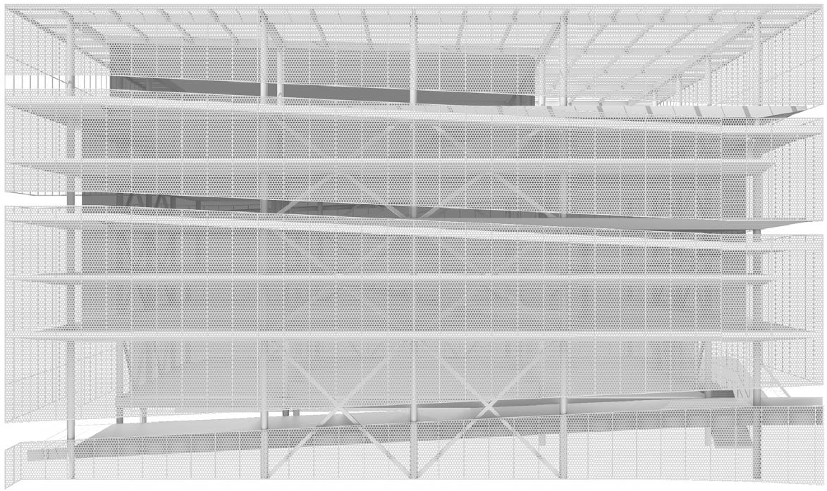 Externally, the building is enveloped by a semi-transparent mesh veil, striking