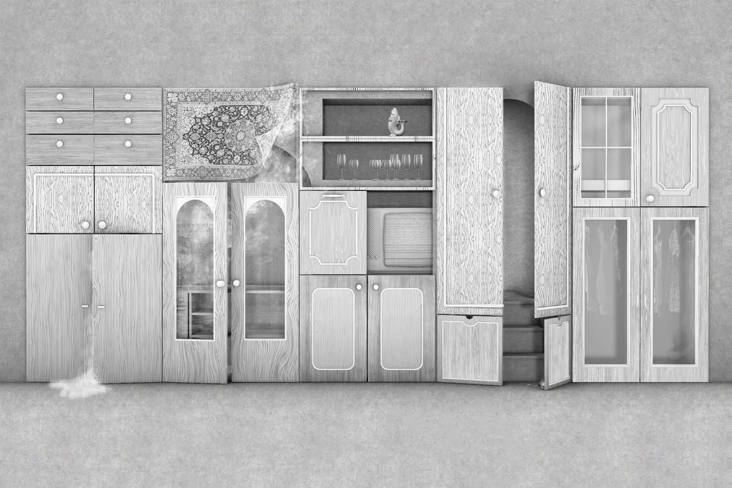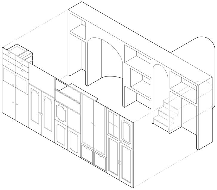 The central concept driving this project is the transformation of personal childhood recollections into surreal architectural expressions. Drawing inspiration from a significant element of familial heritage, namely the ‘furniture wall’ in my grandparents’ home dating back to the Soviet Era, the project unfolds across six distinct spatial configurations or walls. Each space or wall serves as an exploration and reinterpretation of the concept of encapsulating one’s life within a comprehensive floor-to-ceiling furniture ensemble.