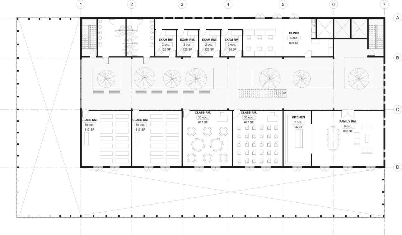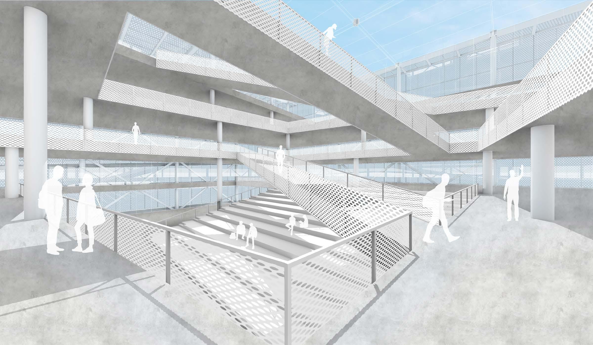 Central to the design is an interior courtyard, serving as a focal point for social gatherings. Accessible via three circulation ramps interwoven with standard vertical circulation elements, the courtyard acts as a dynamic hub of student life, encouraging movement and interaction throughout the school day.
