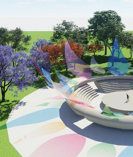 Inspirado na delicadeza e no movimento das flores, o palco foi projetado como uma estrutura viva dentro do espaço público. Em sua forma fechada, as pétalas criam um volume orgânico e escultural que chama a atenção mesmo em momentos de inatividade. Funciona como uma presença silenciosa, mas marcante, no ambiente. Quando ocorre um evento, o palco se abre como uma flor em pleno florescimento. As pétalas se desdobram e revelam o espaço cênico, permitindo que a luz, as cores e o movimento se espalhem, ativando o lugar e enchendo o entorno de vida. A abertura simboliza o despertar da arte, da cultura e da convivência, criando uma atmosfera envolvente e sensorial.