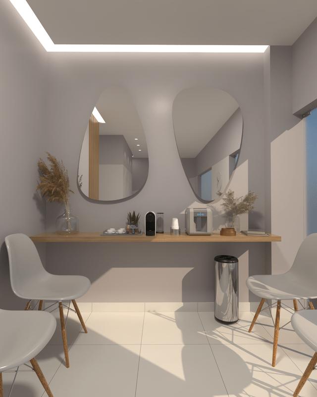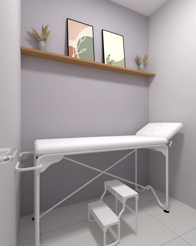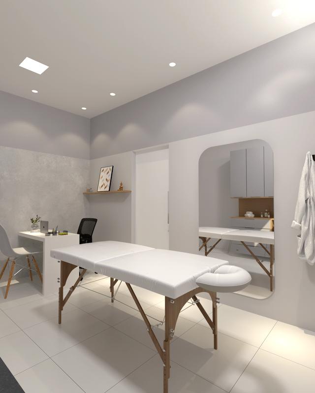 A clínica conta com três salas de atendimento, ofertando serviços de estética, ozônio terapia e massagem. Além de recepção e sala de espera com cantinho para água e café, aconchegando ainda mais o pacientes.