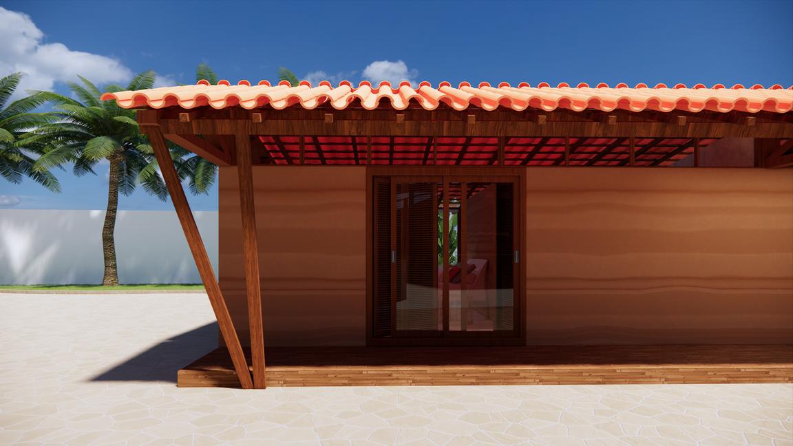 A desvantagem da implantação foi a fachada frontal voltada para o Oeste (maior incidência solar), a solução para esse problema foi a escolha da materialidade e uma circulação frontal com um telhado formando um beiral extenso.