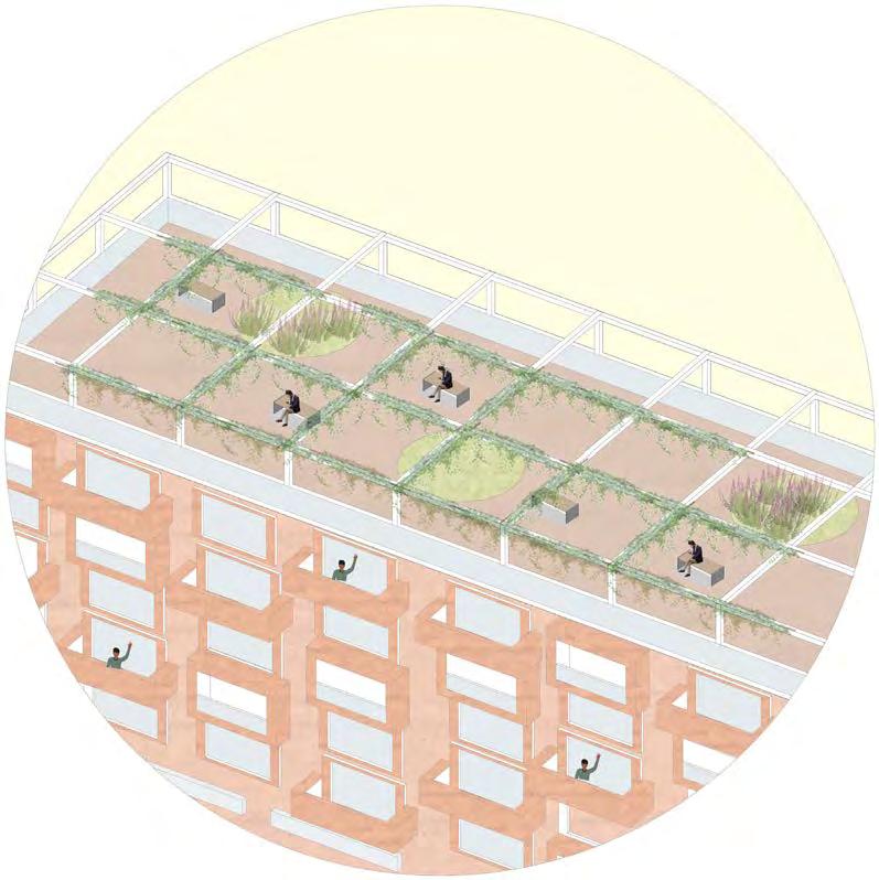 Arches connect one building courtyard to another, creating a continuous flow between spaces. These arches include extensions of the zen garden, with plants and seating that invite pause and reflection. They serve as peaceful transitions that strengthen the sense of community across the site.