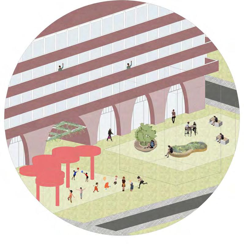 The project emphasizes outdoor activity by mirroring indoor programs in adjacent open-air spaces. This includes features like an outdoor daycare beside the indoor childcare facility. These elements promote a healthy, active lifestyle while supporting community interaction and family-friendly spaces.