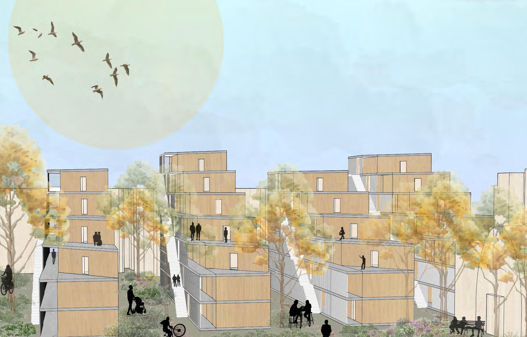 The urban project incorporates a mix of apartment typologies to support diverse living needs and foster community interaction. These range from compact studios for students and faculty to larger 2-3 bedroom units designed for faculty families. Additionally, dedicated dormitories provide shared living spaces for students. This variety encourages vibrant, interconnected communities both within individual buildings and across the entire development.
