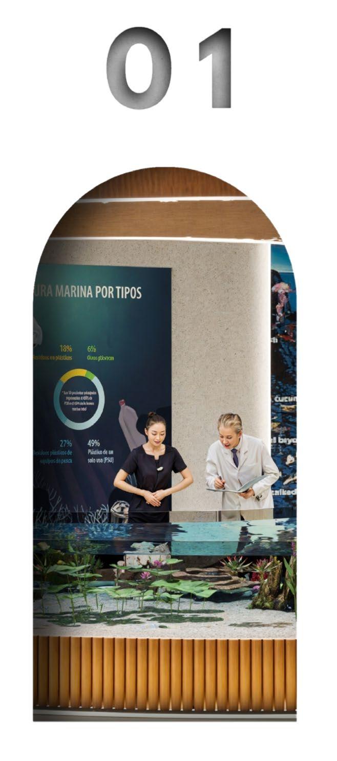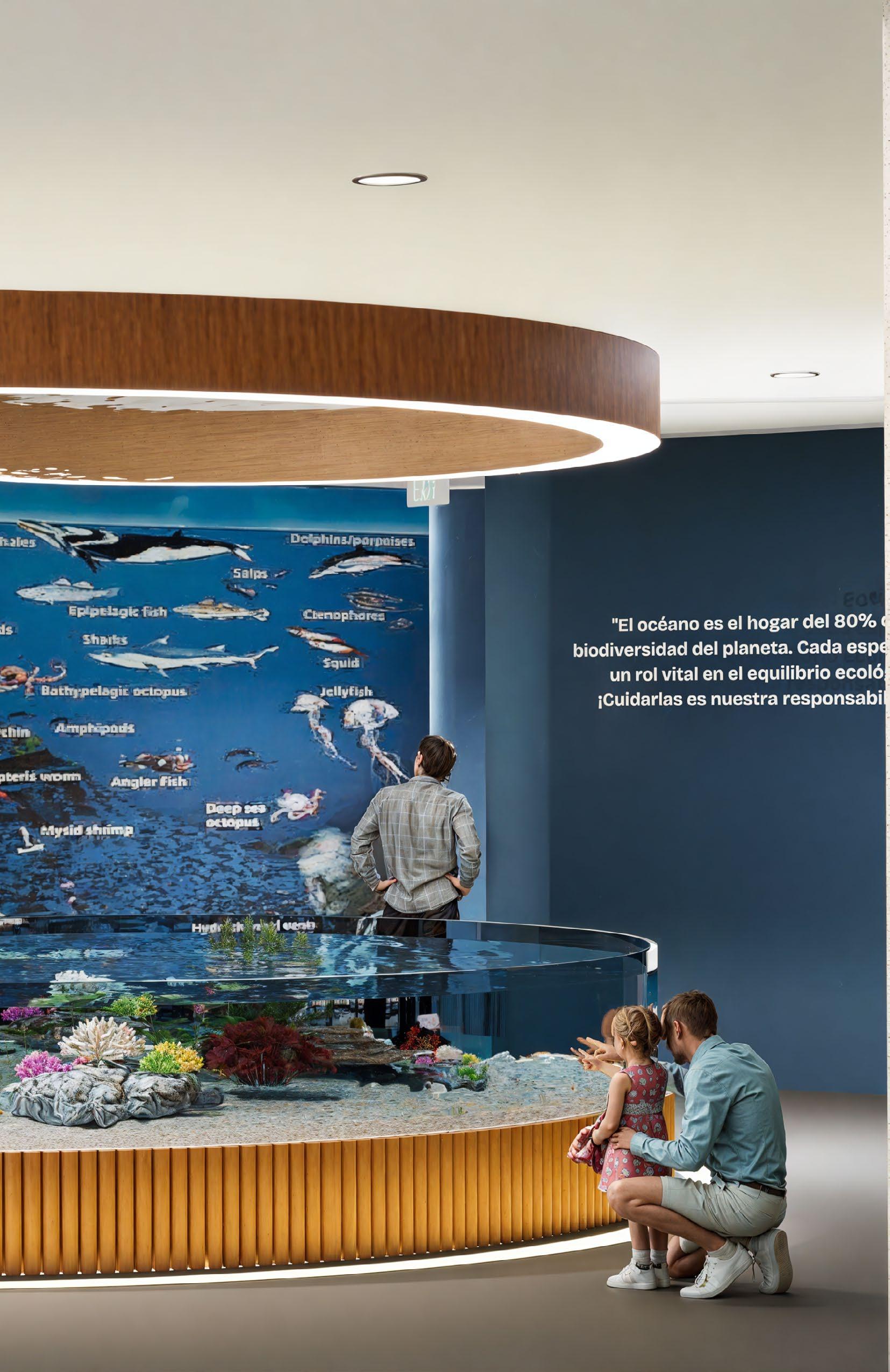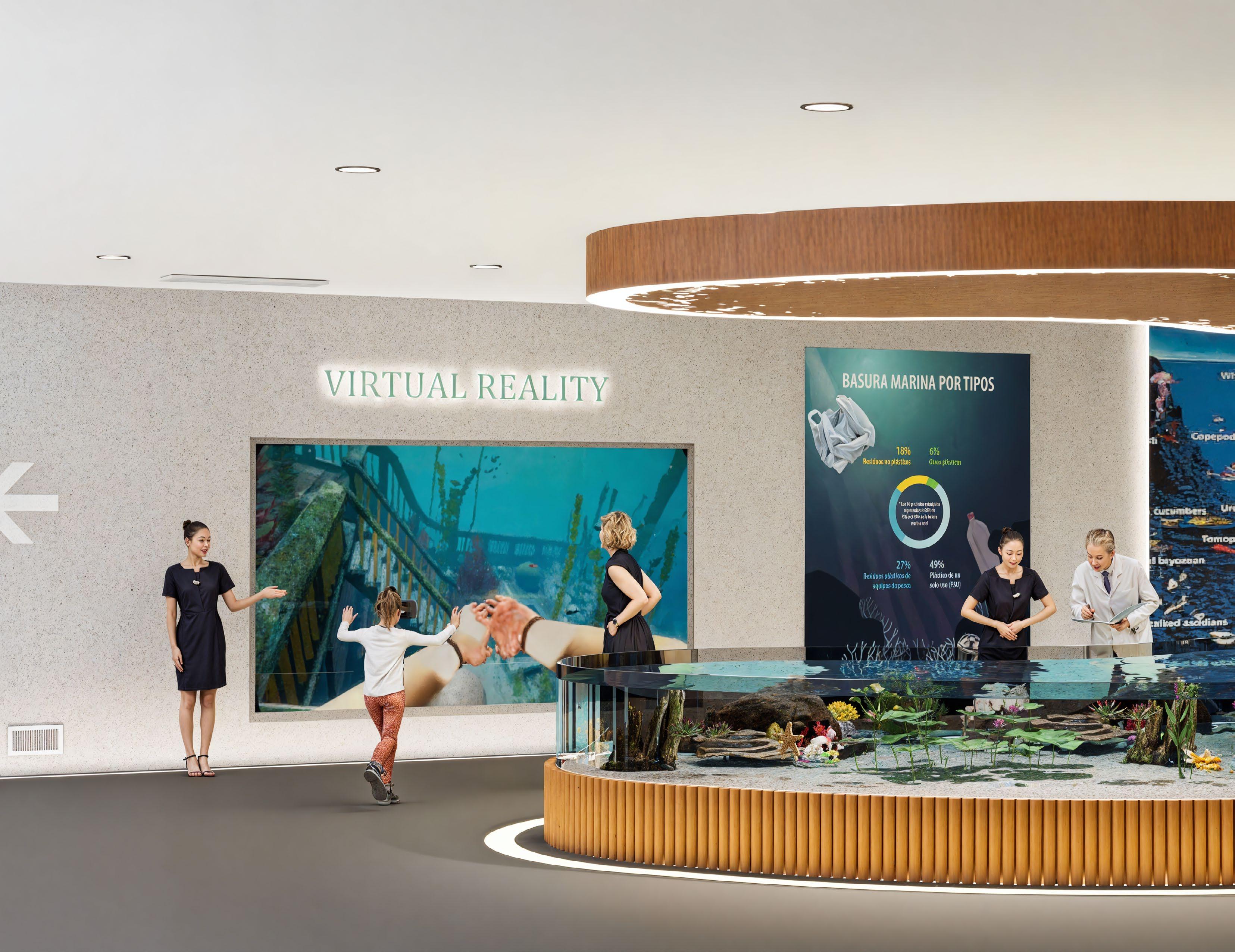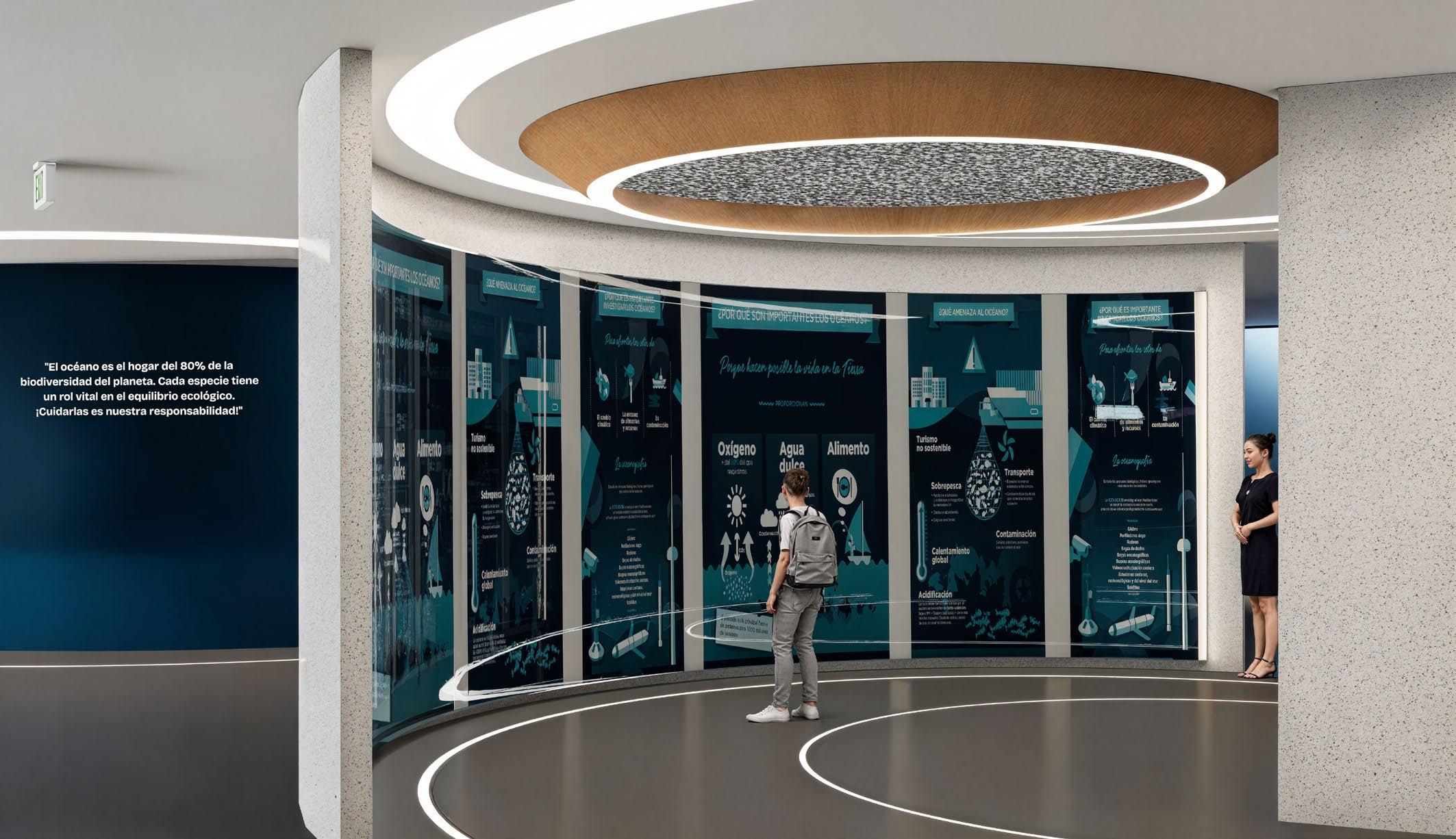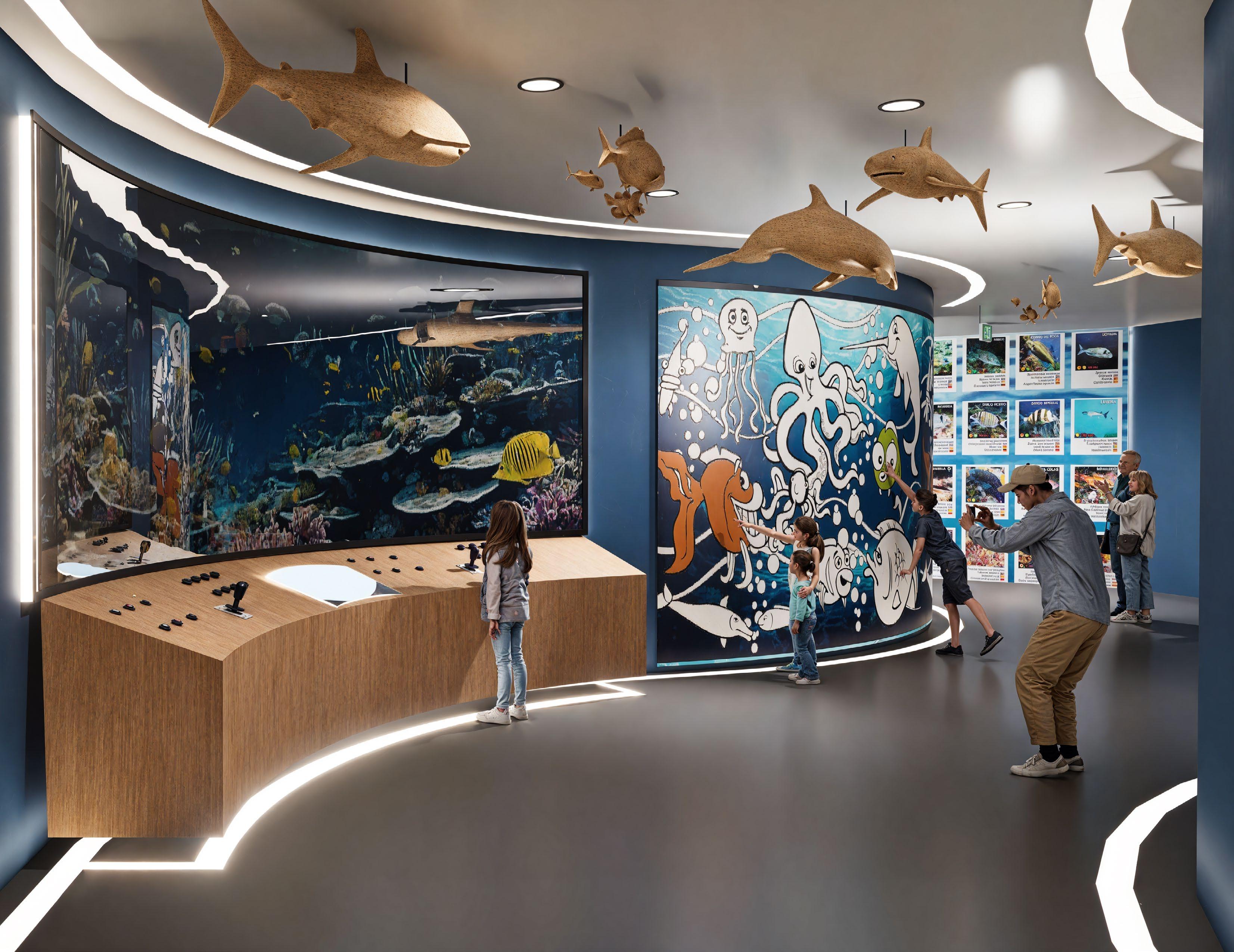 In this information area, guests follow curved interactive paths in the walls that guide them toward a series of touch screens showcasing facts about local marine life and conservation efforts. The rounded corridors culminate in a tunnel where an immersive ocean exploration game lets visitors navigate virtual reefs and identify species. Together, these features turn learning into a hands-on journey blending digital engagement with spatial storytelling to deepen understanding of the marina’s ecological mission.