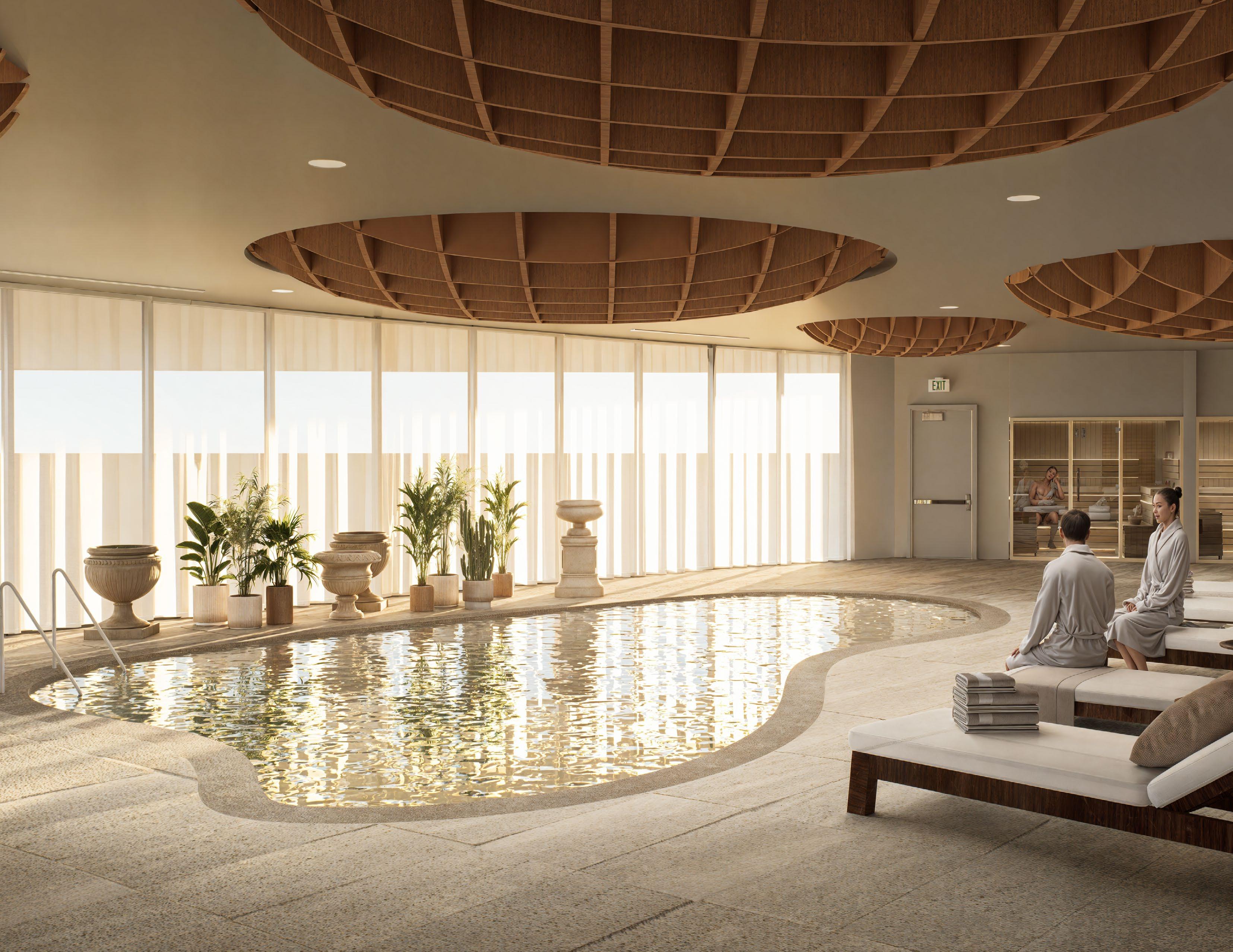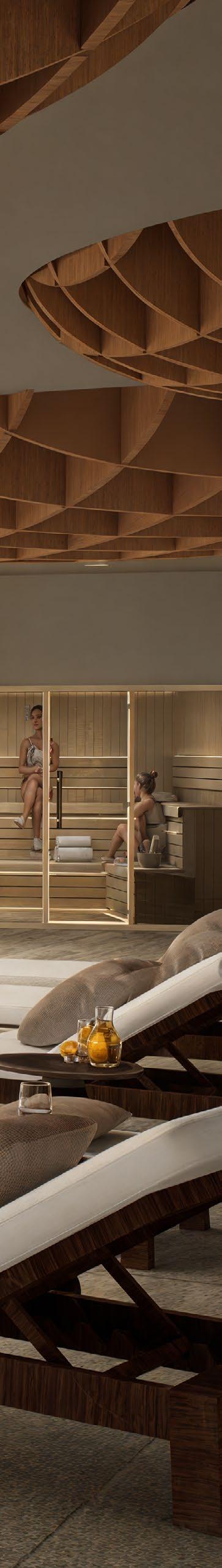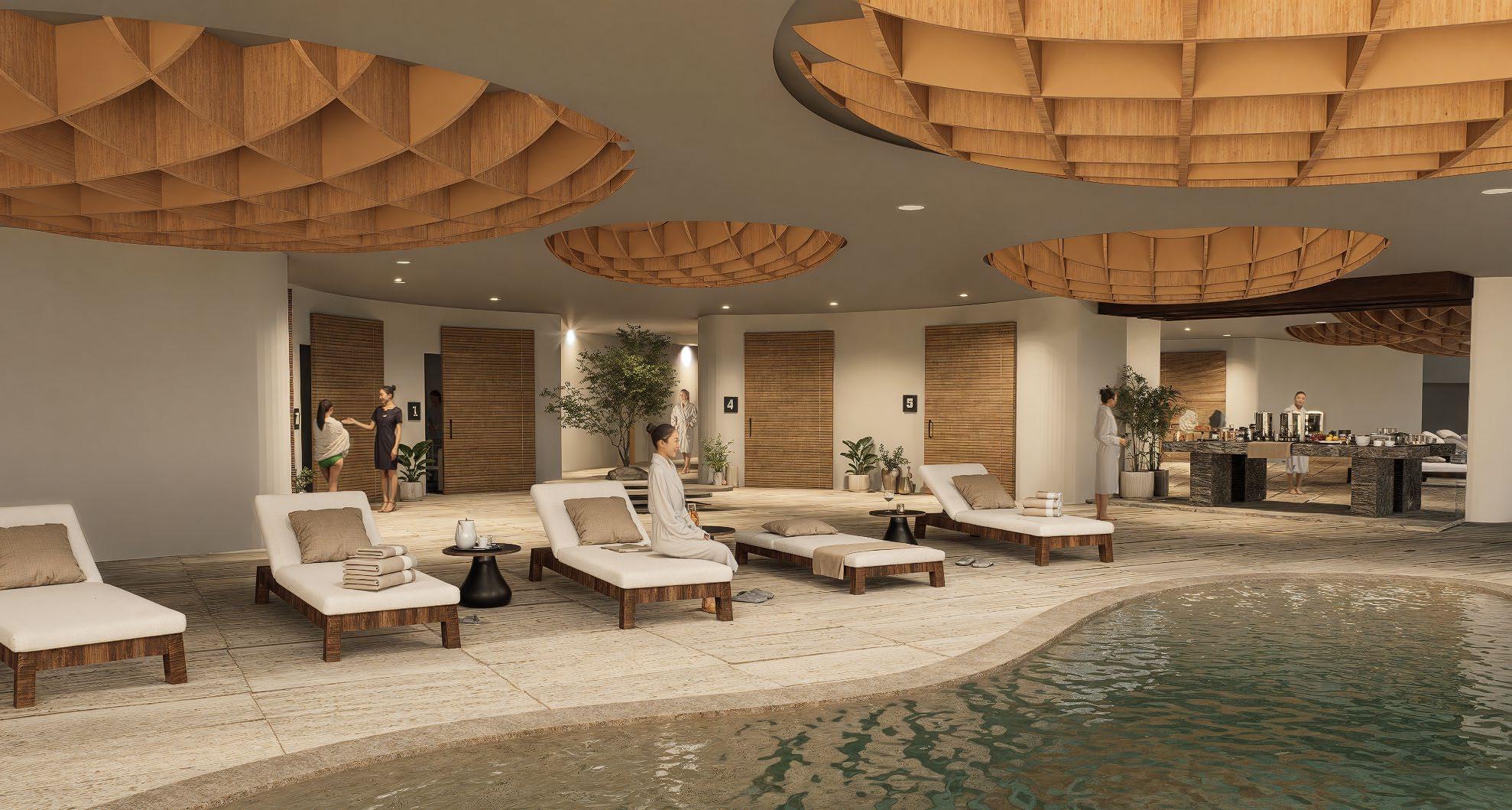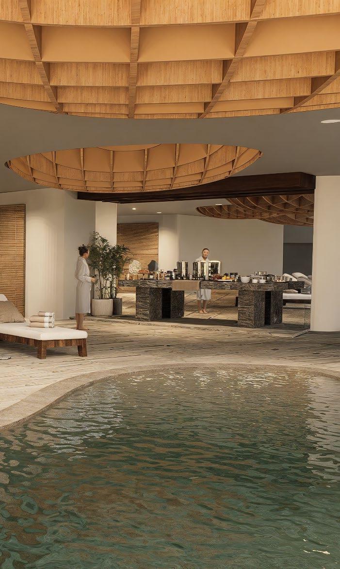 The wellness spa draws inspiration from the serene rhythms of the sea, featuring an open-air design with floor-to-ceiling windows that frame panoramic ocean views. Natural stone sourced locally and reclaimed teak create a calming ambiance, while soft, biophilic touches.