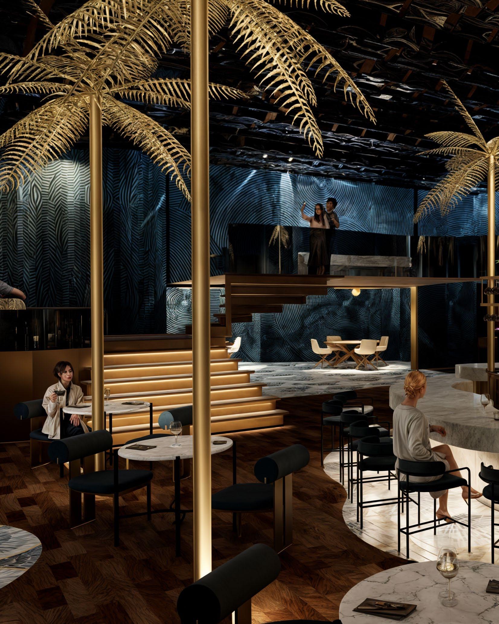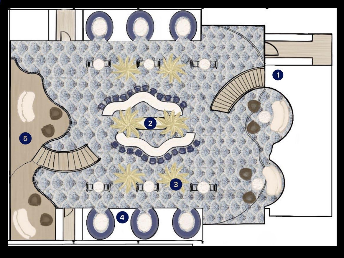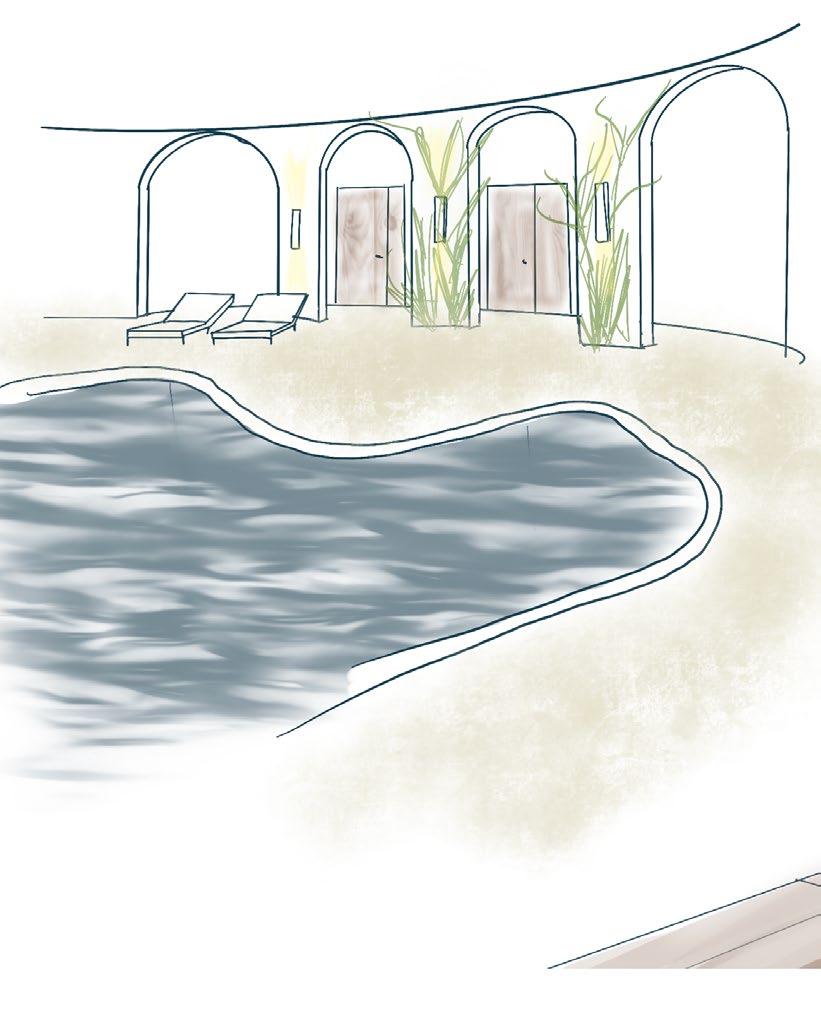 The wellness spa draws inspiration from the serene rhythms of the sea, featuring an open-air design with floor-to-ceiling windows that frame panoramic ocean views. Natural stone sourced locally and reclaimed teak create a calming ambiance, while soft, biophilic touches.