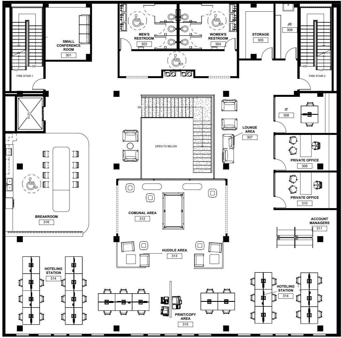 On the third floor, flexibility and collaboration remain key, with a communal area, huddle spaces, and lounges that encourage informal meetings and social connection. Support spaces like the breakroom, private offices, hoteling stations, and IT areas are strategically placed to balance productivity and interaction. Together, the floors create a comfortable, adaptable work environment that reflects Warby Parker’s modern and dynamic office culture.
