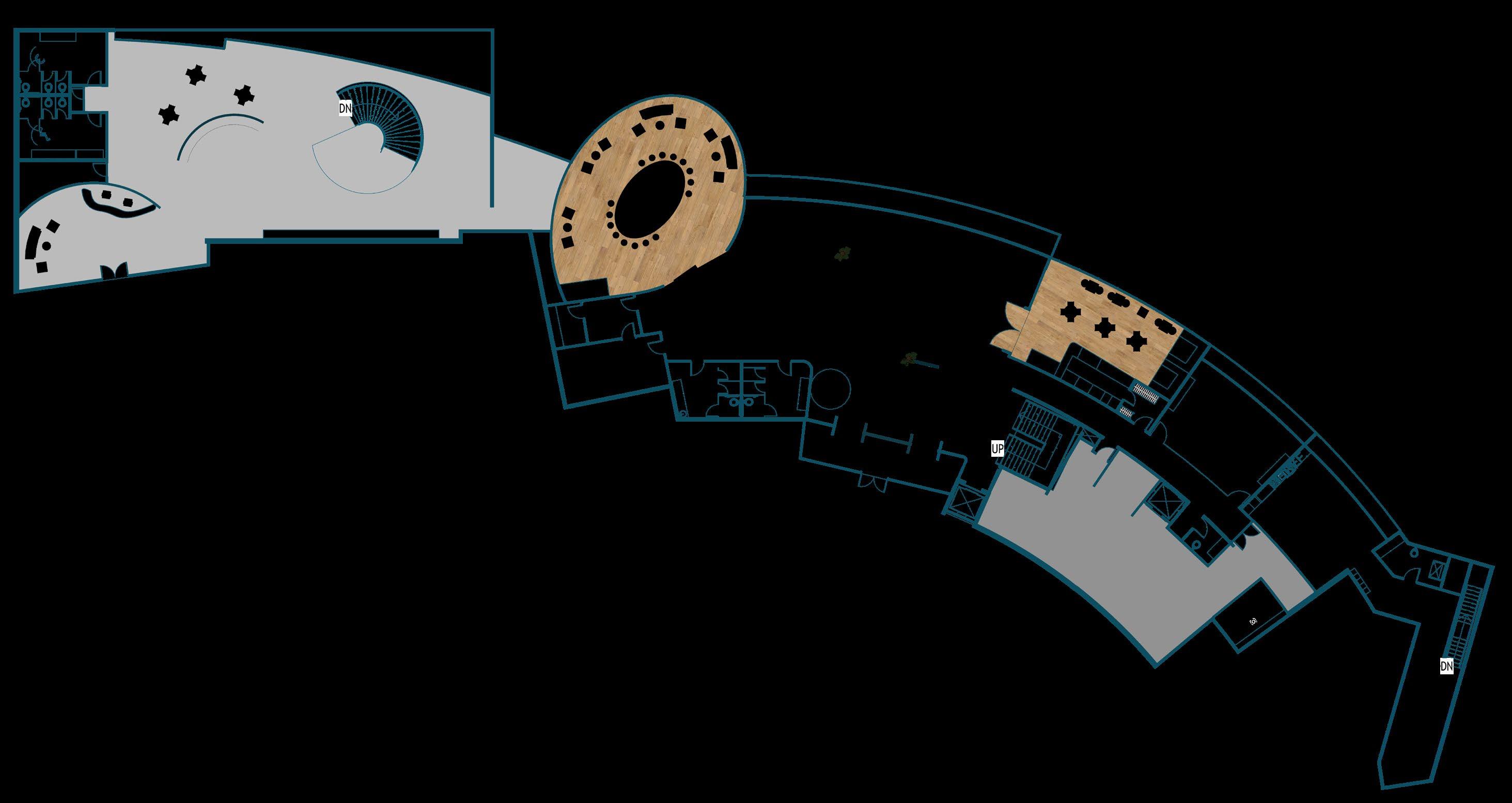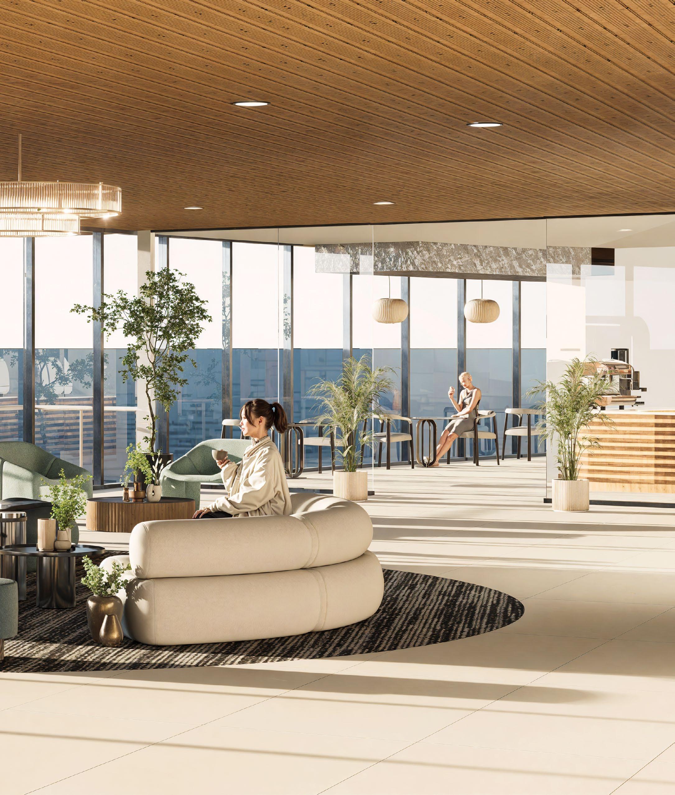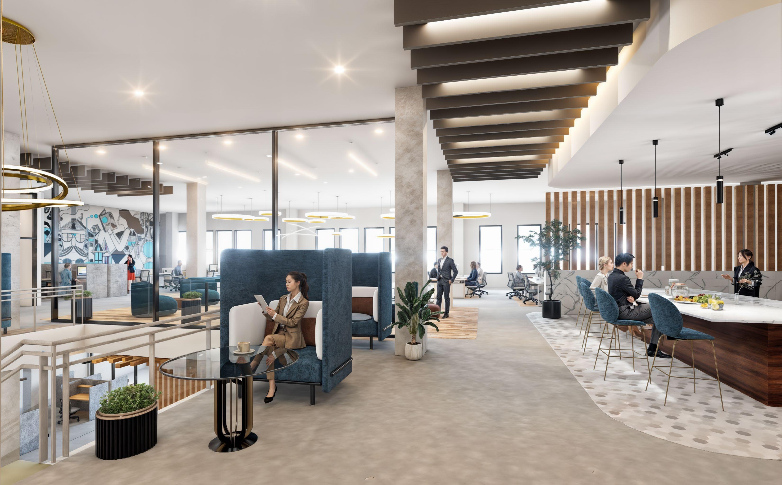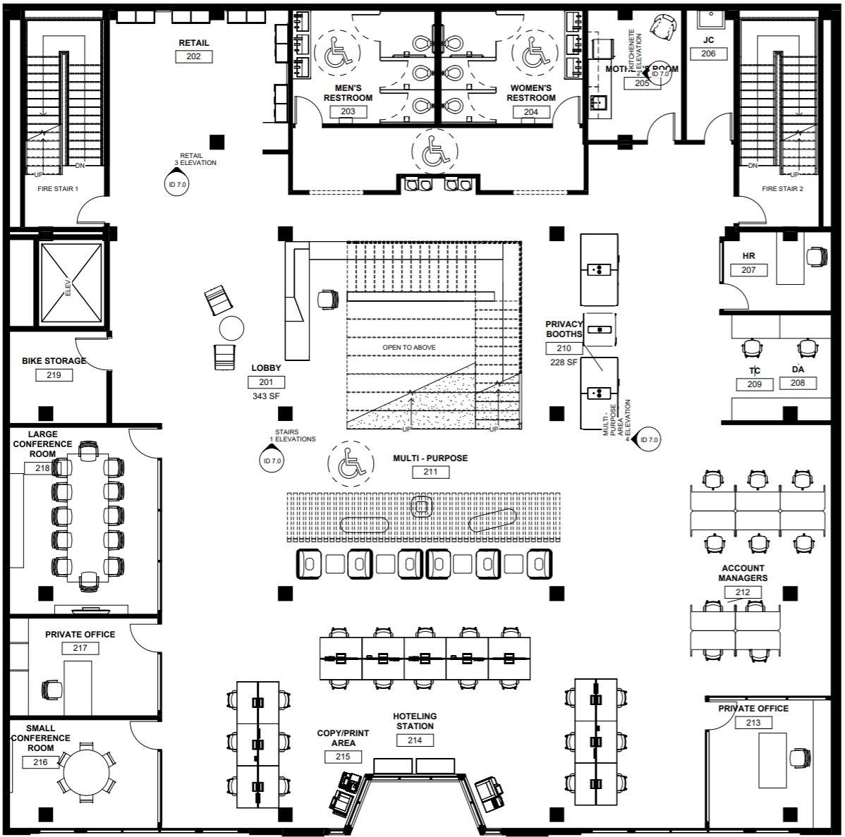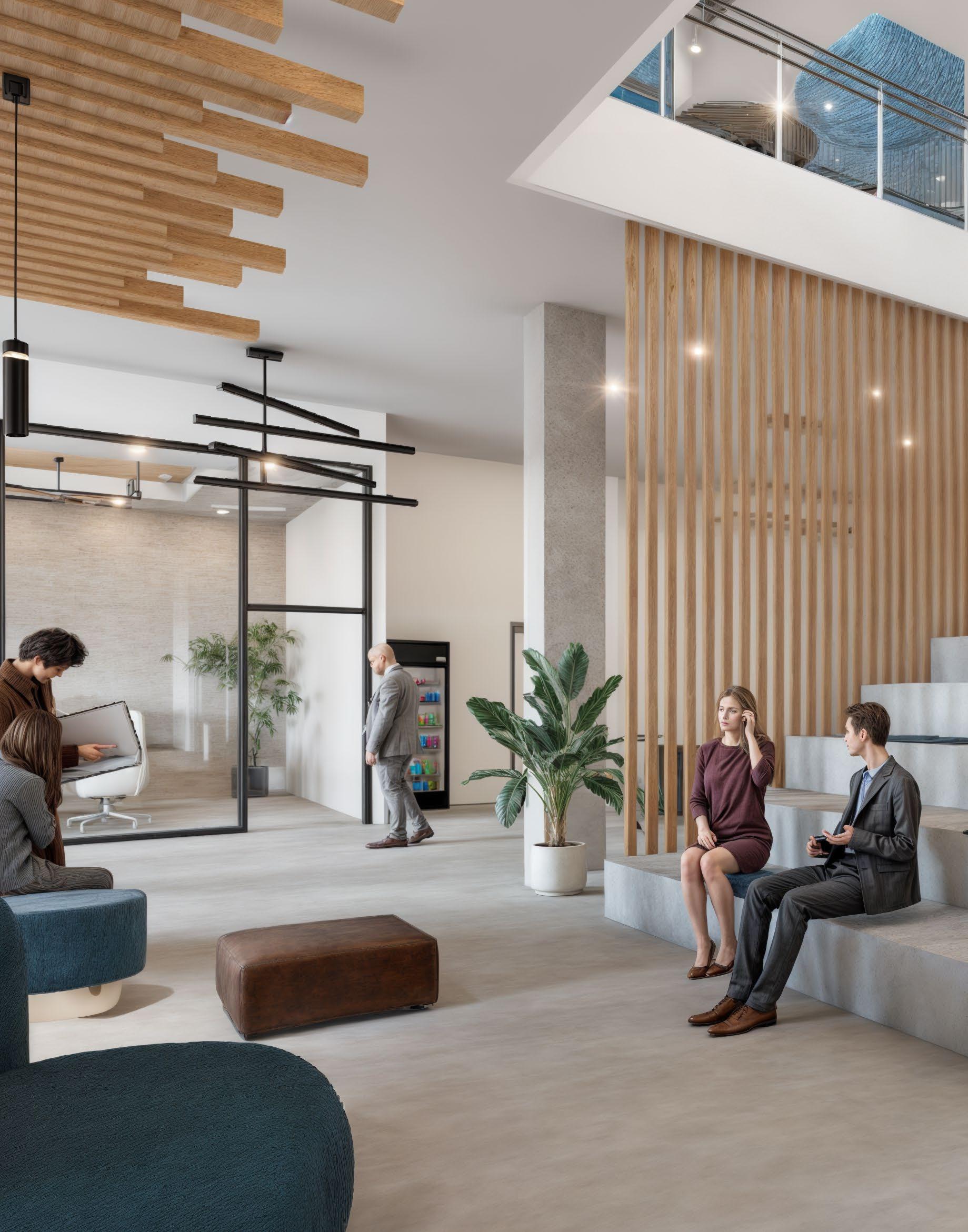 The first floor centers around a multi-purpose tiered seating area, acting as a hub for meetings, events, and casual interactions. A comfortable lobby with lounge seating welcomes visitors, while an adjacent retail space reinforces the brand’s identity. Surrounding the open stair serving as a social anchor are flexible workspaces, privacy booths, hoteling stations, offices, and conference rooms that accommodate a variety of work styles.