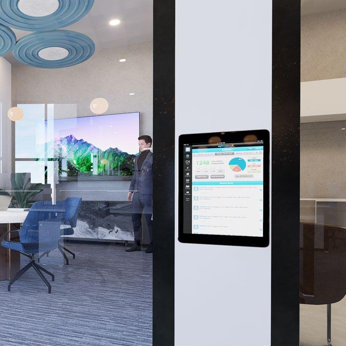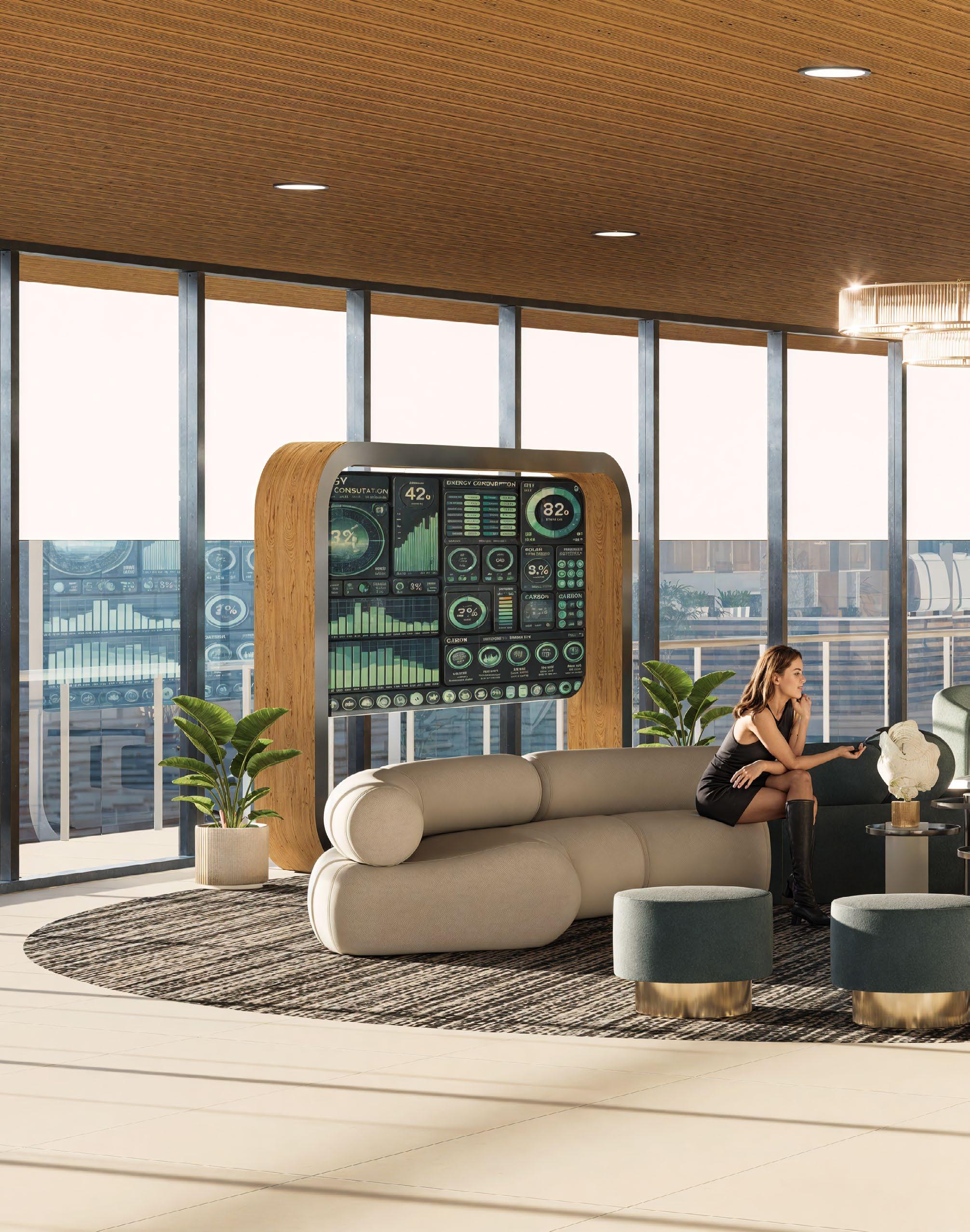 Technology is seamlessly integrated into the design, with smart building systems, digital wayfinding tools, and virtual collaboration platforms. Interactive displays provide room information and collaborative areas.