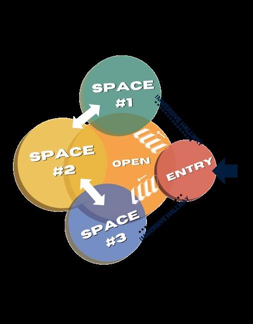 The design uses varied textures, colors, and ambient sounds in transition zones to create subtle sensory shifts that spark creativity.