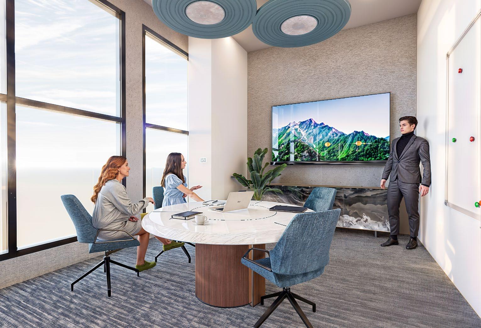 Flexible, unassigned seating next to meeting rooms and private offices, so people can slide seamlessly between quick huddles and focused work. It sparks spontaneous conversations and idea-sharing, supports agile workflows with built-in power and connectivity, and strikes the right balance between open collaboration and individual focus through subtle acoustic design.