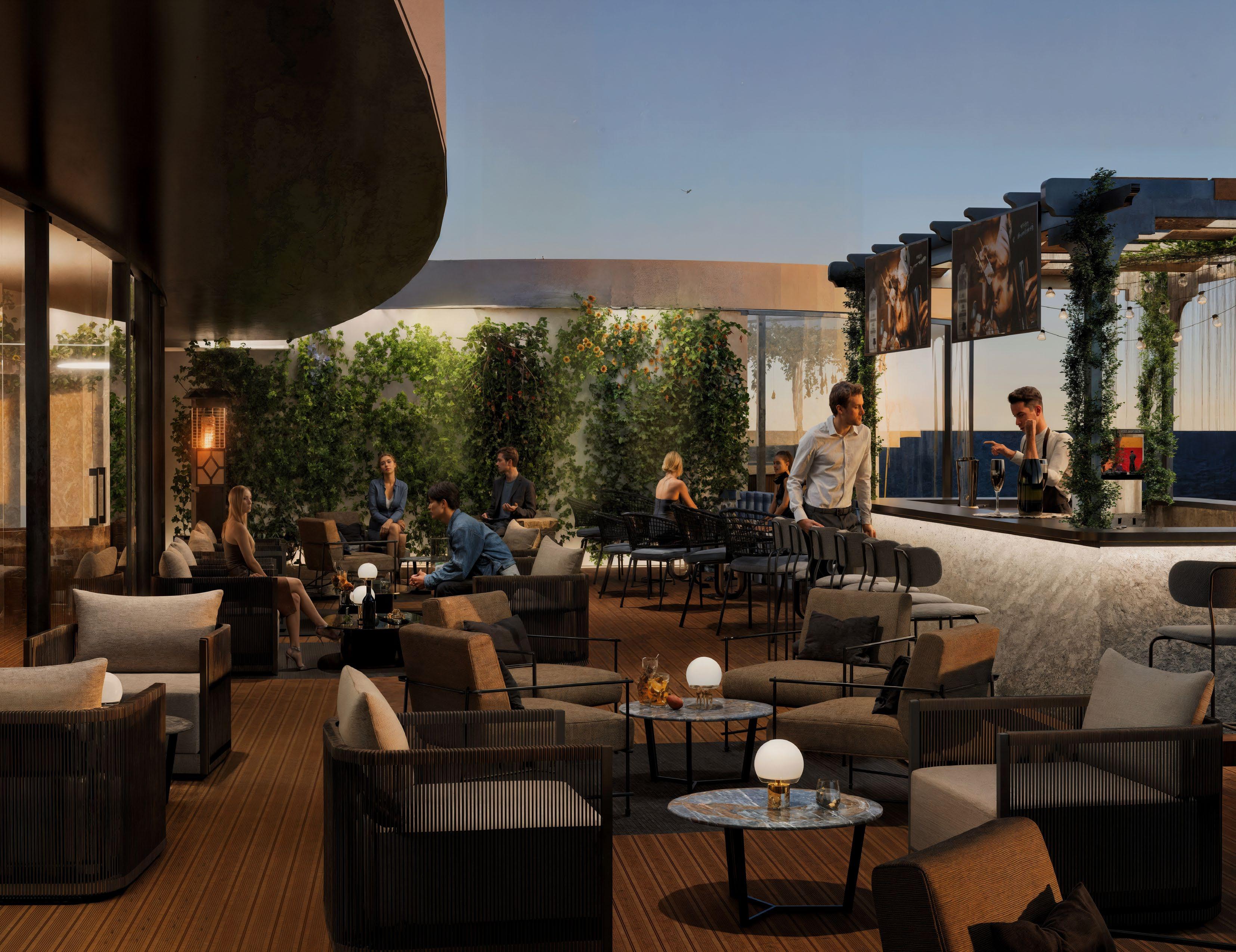 Above the marina’s main clubhouse, the lounge rooftop terrace offers sweeping sea and sky views. Alongside the bamboo bar, weatherproof displays showcase short videos of their signature cocktails in action, the making of our upcycled furniture, and snapshots of other sustainable innovations powering the marina.