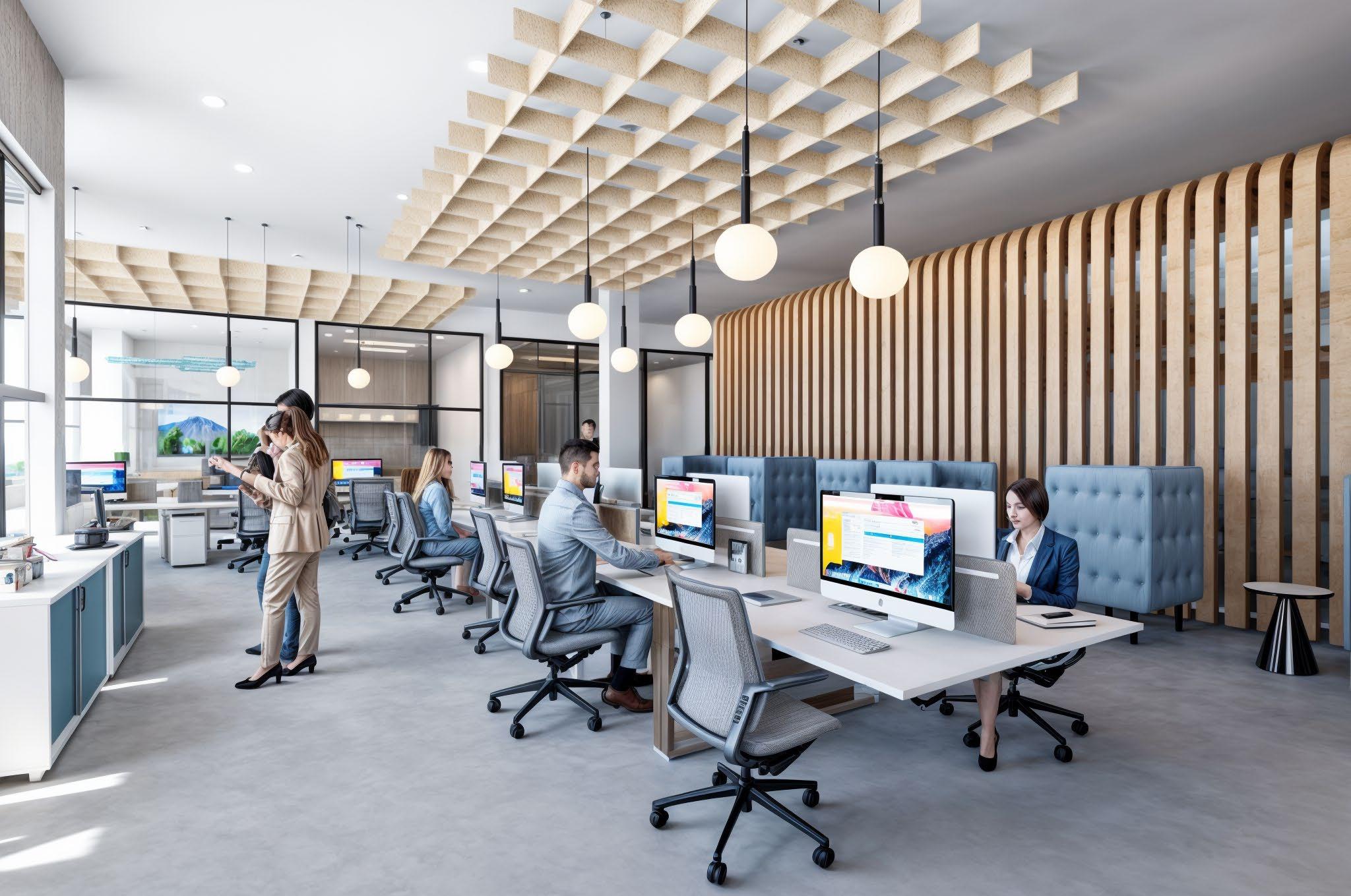 You can see circulation paths that facilitate wayfinding throughout the workspace. Primary circulation routes guide employees through the space.