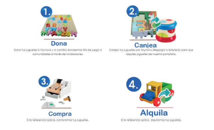 Este servicio se basa en una suscripción ya sea de uno, tres y seis meses o hasta por un año donde los niños reciben en la puerta de su casa dos juguetes de acuerdo con su edad, gustos y habilidades. Por ejemplo para gatear, caminar, contar, u otros para desarrollar su motricidad. Toynovo se encarga de asesorar a los suscriptores a la hora de elegir los juguetes para que escojan los más adecuados para su hijo.