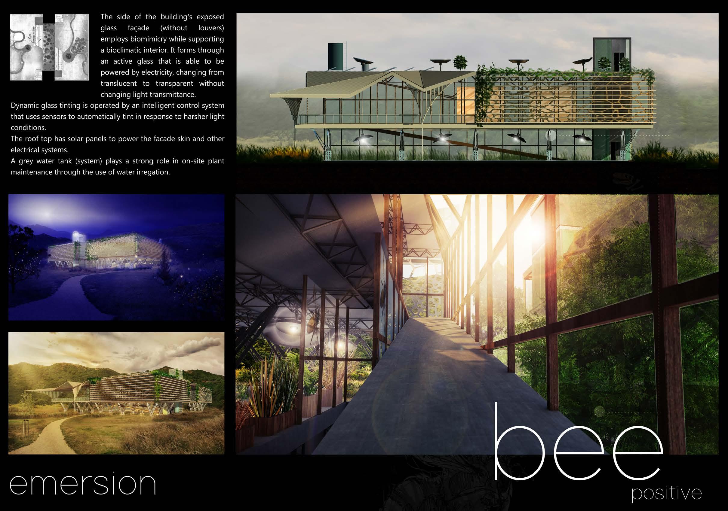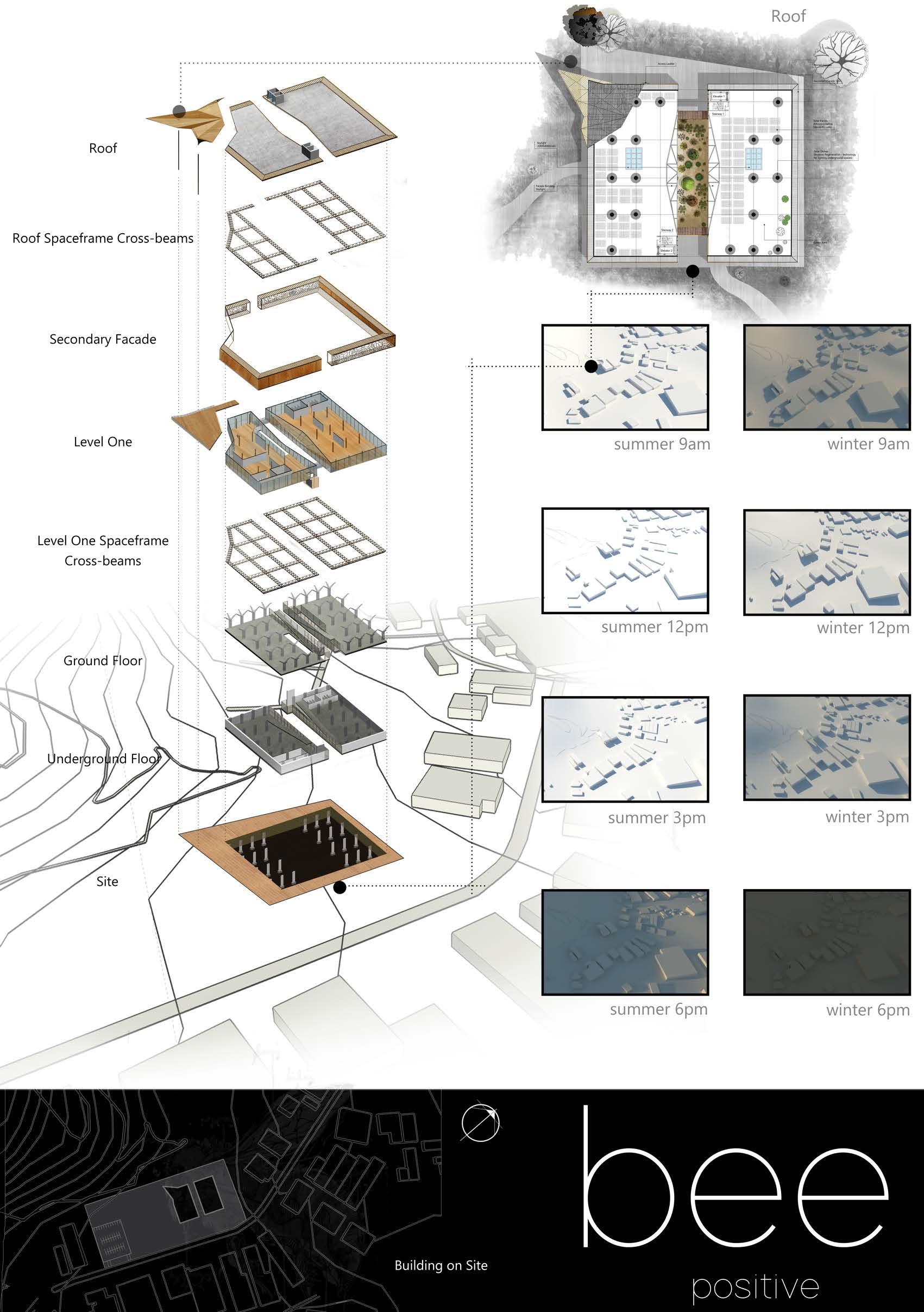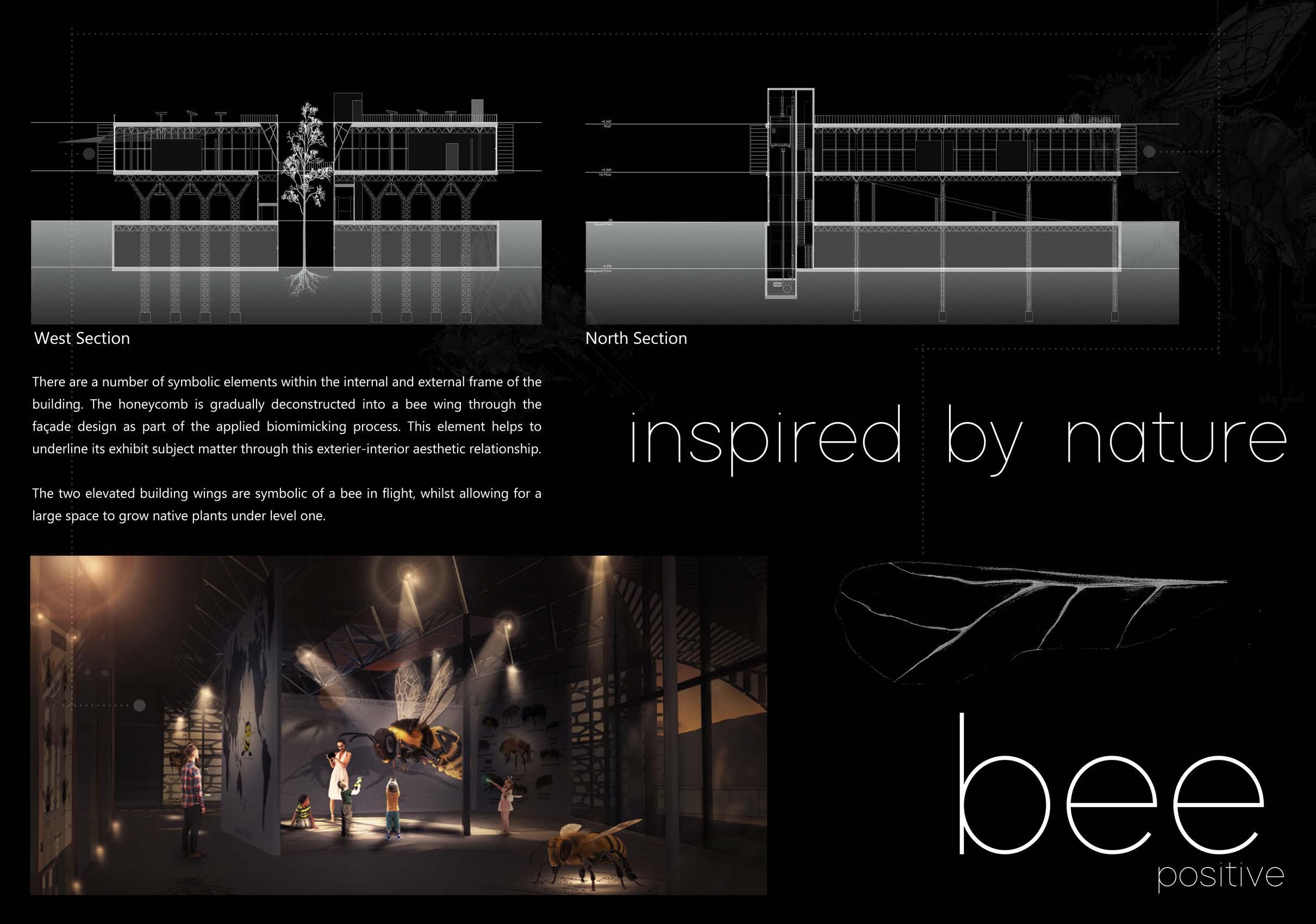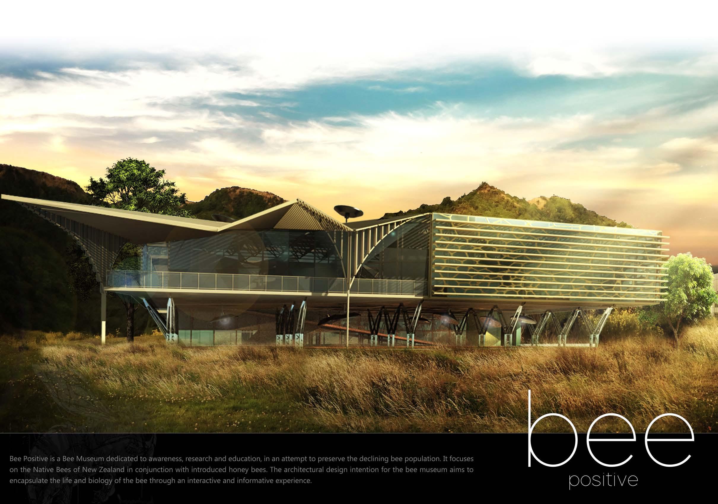 Bee Positive is a bee museum dedicated to awareness, research, and education, in an attempt to preserve the declining bee population. It focuses on the native bees of New Zealand in conjunction with introduced honey bees. Here, the architectural design intention aims to describe the life and biology of the bee through an interactive and informative experience, highlighting the current perils bees face in the current climate. The museum was created as a means to put a spotlight on native Aotearoa bees in particular, and why their preservation needs to be of priority for the sake of the native environment that they serve.