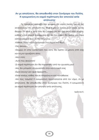 Αν με απολύσετε, θα απευθυνθώ στον Συνήγορο του Πολίτη. Η εγκυμοσύνη σε καμιά περίπτωση δεν αποτελεί αιτία απόλυσης Τις προάλλες φώναξα στο γραφείο την κυρία Ιουλία, για να της ανακοινώσω την απόλυσή της. Είναι 4 μηνών έγκυος κι ο λόγος αυτός θεωρώ ότι είναι η αιτία που δεν μπορώ να την έχω άλλο στην εταιρία, καθώς κάνει συχνά διαλείμματα και σε λίγο καιρό θα πρέπει να πάρει κάποια άδεια κι εγώ να την πληρώνω. -Κάθισε! Θέλω να συζητήσουμε ένα σημαντικό θέμα. -Σας ακούω... -Θεωρώ ότι στην κατάσταση που είστε, θα πρέπει να μείνετε σπίτι σας και να μην εργάζεστε άλλο. -Μα τι λέτε; -Αυτό που ακούσατε! -Σε καμιά περίπτωση δεν θα παραιτηθώ από την εργασία μου! -Μα, δεν μπορείτε να εργαστείτε στην κατάστασή σας -Είμαι έγκυος! Δεν είμαι άρρωστη... -Είσαι τελείως ηλίθια; Να σε πληρώνω κι εσύ να κάθεσαι; -Μα πώς τολμάτε! Η εγκυμοσύνη προστατεύεται από τον νόμο. Αν με απολύσετε, θα απευθυνθώ στον Συνήγορο του Πολίτη. Η εγκυμοσύνη σε καμιά περίπτωση δεν αποτελεί αιτία απόλυσης. Ιωάννα Χ.