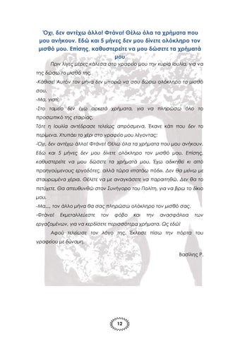 Όχι, δεν αντέχω άλλο! Φτάνει! Θέλω όλα τα χρήματα που μου ανήκουν. Εδώ και 5 μήνες δεν μου δίνετε ολόκληρο τον μισθό μου. Επίσης, καθυστερείτε να μου δώσετε τα χρήματά μου Πριν λίγες μέρες κάλεσα στο γραφείο μου την κυρία Ιουλία, για να της δώσω το μισθό της. -Κάθισε! Αυτόν τον μήνα δεν μπορώ να σου δώσω ολόκληρο το μισθό σου. -Μα, γιατί; -Στο ταμείο δεν έχω αρκετά χρήματα, για να πληρώσω όλο το προσωπικό της εταιρίας. Τότε η Ιουλία αντέδρασε τελείως απρόσμενα. Έκανε κάτι που δεν το περίμενα. Χτυπάει το χέρι στο γραφείο μου λέγοντας: -Όχι, δεν αντέχω άλλο! Φτάνει! Θέλω όλα τα χρήματα που μου ανήκουν. Εδώ και 5 μήνες δεν μου δίνετε ολόκληρο τον μισθό μου. Επίσης, καθυστερείτε να μου δώσετε τα χρήματά μου. Έχω αδικηθεί κι από προηγούμενους εργοδότες, αλλά τώρα «πατάω πόδι». Δεν θα μείνω με σταυρωμένα χέρια. Θέλετε να με αναγκάσετε να παραιτηθώ. Δεν θα το πετύχετε. Θα απευθυνθώ στον Συνήγορο του Πολίτη, για να βρω το δίκιο μου. -Μα..., τον άλλο μήνα θα σας πληρώσω ολόκληρο τον μισθό σας. -Φτάνει!