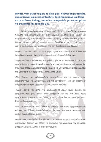 Μιλάω, γιατί θέλω να βρω το δίκιο μου. Νιώθω ότι με αδικείτε, κυρία Ντάνα, και με προσβάλλετε. Εργάζομαι πολύ και θέλω να με σέβεστε. Επίσης, απαιτώ να πληρωθώ, για να μπορέσω να συνεχίσω την εργασία μου. Τέσσερα χρόνια έχουν περάσει από τότε που εργαζόταν η κυρία Κουνέλο ως επιμελήτρια σε έναν μεγάλο εκδοτικό οίκο χωρίς να πληρώνεται τις υπερωρίες. Δούλευε 14 ώρες με υπερβολικά χαμηλό. Κάποια μέρα την φώναξε στο γραφείο η διευθύντρια της, η κυρία Ντάνα, για να συζητήσουν την απόδοσή της στη διόρθωση των βιβλίων. -Κυρία Κούνελο, εδώ και έναν μήνα έχετε τον οδηγό του Βόλου να διορθώσετε και δεν έχετε τελειώσει ακόμα τη δουλειά. Τι θα γίνει; -Κυρία Ντάνα, η διόρθωση του βιβλίου γίνεται σε συνεργασία με τους αρχαιολόγους οι οποίοι καθυστερούν να μας στείλουν τις πληροφορίες που τους ζητάμε, με αποτέλεσμα το έργο να μην μπορεί να προχωρήσει πιο γρήγορα. Δεν εξαρτάται, λοιπόν, από μένα. -Τότε, λοιπόν, να ενδιαφερθείτε περισσότερο και να πιέσετε τους αρχαιολόγους να εργαστούν, για να εργαστούν, για να εκδοθεί ο οδηγός άμεσα πριν αρχίσουν οι Ολυμπιακοί Αγώνες. -Κυρία Ντάνα, ναι, αλλά εγώ εργάζομαι 14 ώρες χωρίς αμοιβή. Τα χρήματα που μου δίνετε είναι ελάχιστα και για να βρω τους αρχαιολόγους απαιτείται κι άλλος χρόνος. Πότε θα τα προλάβω όλα. Έχω και δύο παιδιά…. -Δεν με ενδιαφέρει. Εγώ θέλω ο οδηγός για τους αρχαιολογικούς χώρους του Βόλου να εκδοθεί άμεσα. Αν είναι απαραίτητο να εργαστείς ακόμη περισσότερες ώρες. -Αυτό που μου ζητάτε δεν γίνεται. Και απαιτώ να μου πληρώσετε τις υπερωρίες. Επίσης, αν θέλετε να τελειώσω πιο γρήγορα την εργασία, μπορείτε να μου δώσετε κι έναν συνεργάτη