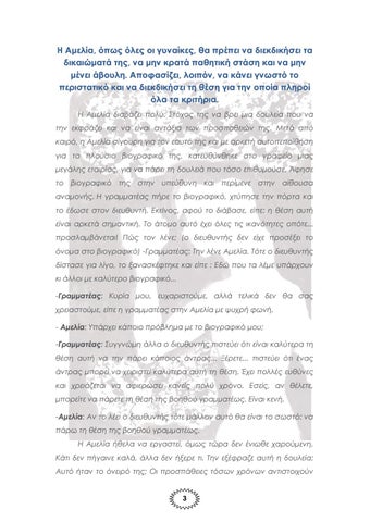 Η Αμελία, όπως όλες οι γυναίκες, θα πρέπει να διεκδικήσει τα δικαιώματά της, να μην κρατά παθητική στάση και να μην μένει άβουλη. Αποφασίζει, λοιπόν, να κάνει γνωστό το περιστατικό και να διεκδικήσει τη θέση για την οποία πληροί όλα τα κριτήρια. Η Αμελία διαβάζει πολύ. Στόχος της να βρει μια δουλεία που να την εκφράζει και να είναι αντάξια των προσπαθειών της. Μετά από καιρό, η Αμελία σίγουρη για τον εαυτό της και με αρκετή αυτοπεποίθηση για το πλούσιο βιογραφικό της, κατευθύνθηκε στο γραφείο μιας μεγάλης εταιρίας, για να πάρει τη δουλειά που τόσο επιθυμούσε. Άφησε το βιογραφικό της στην υπεύθυνη και περίμενε στην αίθουσα αναμονής. Η γραμματέας πήρε το βιογραφικό, χτύπησε την πόρτα και το έδωσε στον διευθυντή. Εκείνος, αφού το διάβασε, είπε: η θέση αυτή είναι αρκετά σημαντική. Το άτομο αυτό έχει όλες τις ικανότητες οπότε... προσλαμβάνεται! Πώς τον λένε; (ο διευθυντής δεν είχε προσέξει το όνομα στο βιογραφικό) -Γραμματέας: Την λένε Αμελία. Τότε ο διευθυντής δίστασε για λίγο, το ξανασκέφτηκε και είπε : Εδώ που τα λέμε υπάρχουν κι άλλοι με καλύτερο βιογραφικό... -Γραμματέας: Κυρία μου, ευχαριστούμε, αλλά τελικά δεν θα σας χρειαστούμε, είπε η γραμματέας στην Αμελία με ψυχρή φωνή. - Αμελία: Υπάρχει κάποιο πρόβλημα με το βιογραφικό μου; -Γραμματέας: Συγγνώμη άλλα ο διευθυντής πιστεύει ότι είναι καλύτερα τη θέση αυτή να την πάρει κάποιος άντρας... Ξέρετε... πιστεύει ότι ένας άντρας μπορεί να χειριστεί καλύτερα αυτή τη θέση. Έχει πολλές ευθύνες και χρειάζεται να αφιερώσει κανείς πολύ χρόνο. Εσείς, αν θέλετε, μπορείτε να πάρετε τη θέση της βοηθού γραμματέως. Είναι κενή. -Αμελία: Αν το λέει ο διευθυντής τότε μάλλον αυτό θα είναι το σωστό: να πάρω τη θέση της βοηθού γραμματέως. Η Αμελία ήθελα να εργαστεί, όμως τώρα δεν ένιωθε χαρούμενη. Κάτι δεν πήγαινε καλά, άλλα δεν ήξερε τι. Την εξέφραζε αυτή η δουλεία; Αυτό ήταν το όνειρό της; Οι προσπάθειες τόσων χρόνων αντιστοιχούν 3