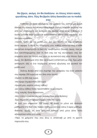 Να ξέρετε, ακόμη, ότι θα διαδώσω σε όλους πόσο κακός εργοδότης είστε. Πώς θα βρείτε άλλη δασκάλα για τα παιδιά σας; Καθόταν για ώρες κλεισμένος στο γραφείο του, ώσπου μια φωνή διέκοψε την ηρεμία του «Καλησπέρα σας!». Εκείνος σήκωσε τα μάτια του από τον υπολογιστή και αντίκρισε την Ιουλίας «Εσύ είσαι; Τι θέλεις;». Η Ιουλία εισήλθε στον χώρο και κοντοστάθηκε δίπλα στην καρέκλα. Δεν δίστασε να καθίσει. -Λοιπόν, ήρθα για τον μισθό μου. Δεν είχα σκοπό να σας ενοχλήσω όσον αφορά το θέμα της πληρωμής μου, καθώς κατανοώ πως η κάθε οικογένεια αντιμετωπίζει τα δικά της προβλήματα. Θεωρώ, όμως, πως με δυο καλοπληρωμένες σαν τη δική σας και της συντρόφου σας δεν στερείστε ούτε την άνεσή σας ούτε το αυτοκίνητό σας ούτε τίποτα. Εγώ, όμως, δεν βρίσκομαι στην ίδια οικονομική κατάσταση με σας. Έχω μείνει απλήρωτη εδώ κι ένα τετράμηνο. Απαιτώ εξηγήσεις και φυσικά τον μισθό μου! Εκείνος βγάζει από ένα συρτάρι του γραφείου του έναν φάκελο που περιείχε 200 ευρώ και τον δίνει στην Ιουλία. -Ορίστε τα 200 σας ευρώ. -Μα είχαμε συμφωνήσει 320 ευρώ -Χρυσό μου, κορίτσι, κάνεις λάθος! -Δεν κάνω λάθος! Εσείς προσπαθείτε να με κλέψετε. -Πώς τολμάς; Είσαι θρασύτατη -Μα, τι λέτε;! Η διεκδίκηση των δικαιωμάτων είναι θράσος; -Έχω σημειώσει ότι έχουμε συμφωνήσει 200 ευρώ. -Κι εγώ έχω σημειώσει 320 ευρώ, 80 ευρώ το μήνα για ιδιαίτερα μαθήματα στα δύο σας παιδιά. Καθημερινά τους κάνω 3 ώρες μάθημα. Φαίνεται, όμως, ότι όσα χρήματα λείπουν από μένα άλλη τόση αξιοπρέπεια λείπει από εσάς. -Πάρε τα χρήματα που σου δίνω κι απάλλαξέ με από τη φρικτή παρουσία σου.
