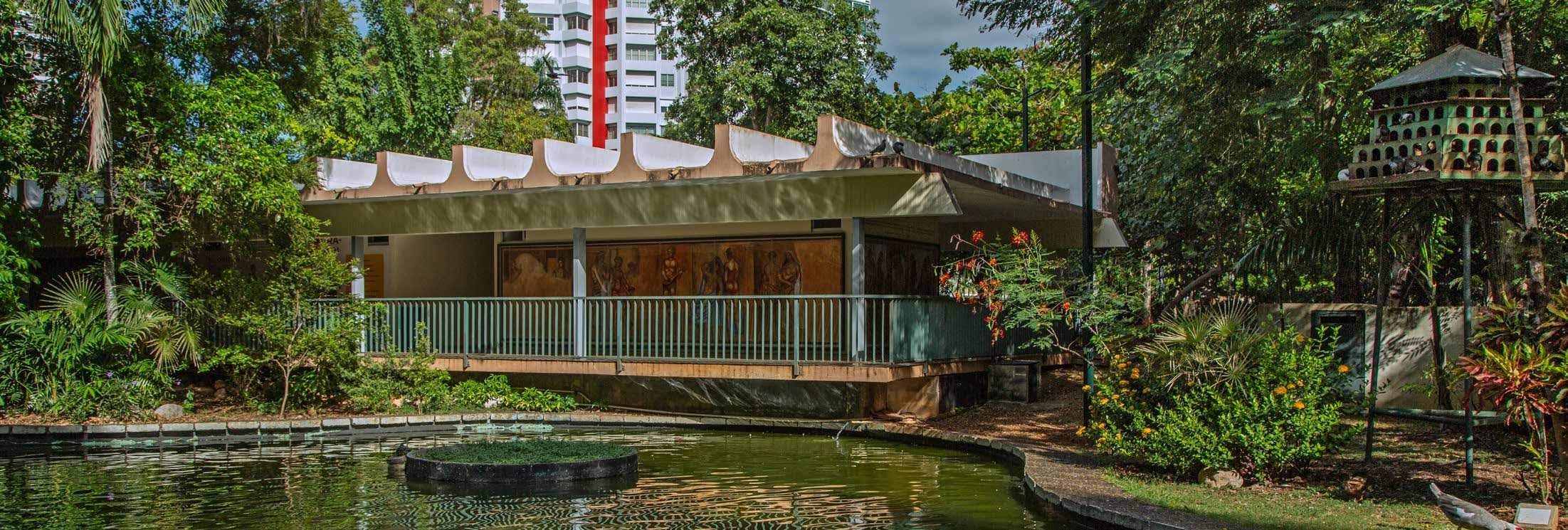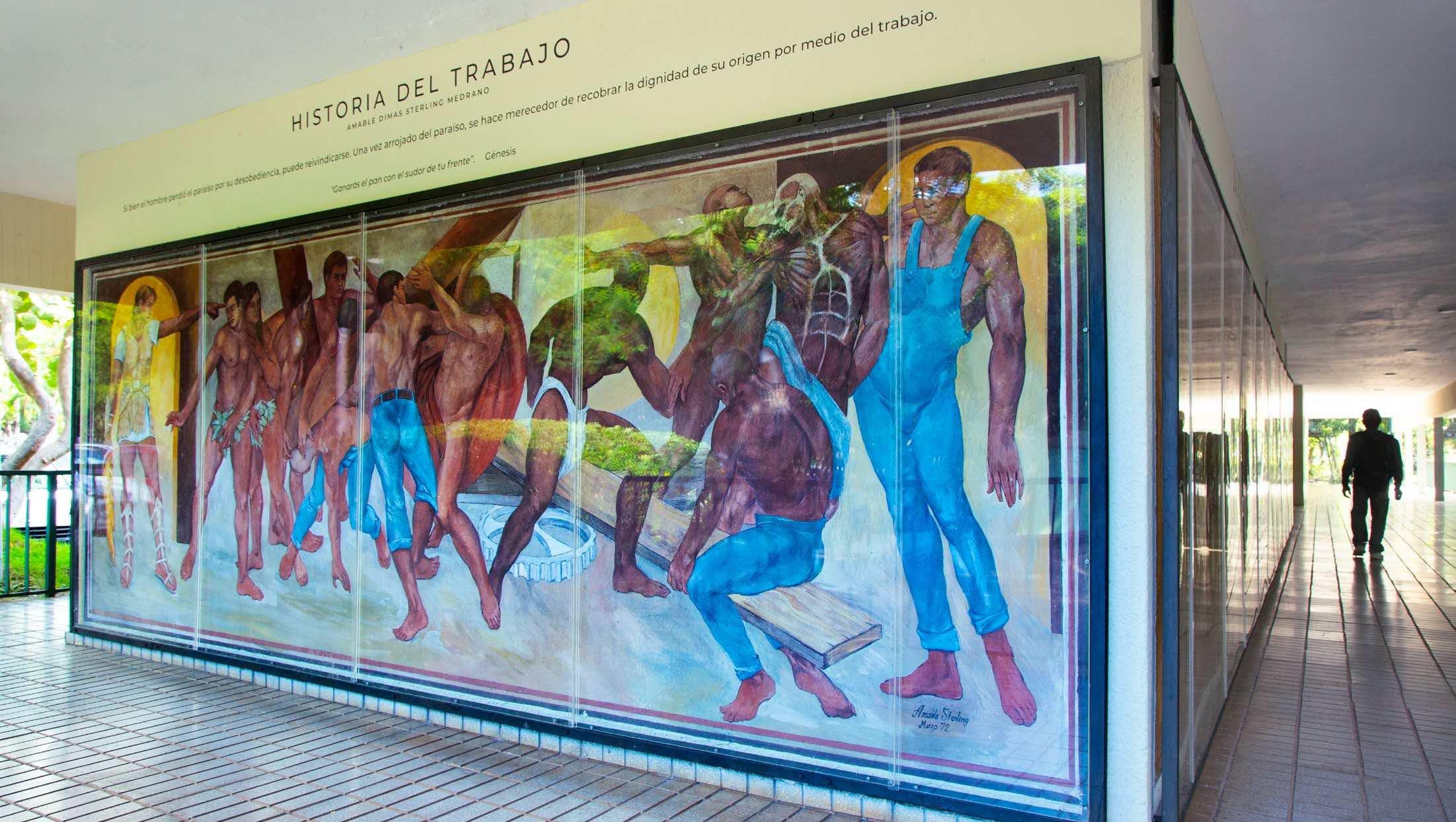 Occidental a este Nuevo Mundo. Fueron creados durante la década de los setenta, por los artistas José Ramírez Conde y Norberto Sterling bajo la técnica del fresco, es decir, sobre un cemento aun húmedo. Esta narrativa compartida y no planeada, tal cual sucede con el arte, nos invita primeramente a extasiarnos frente al mural llamado Vulcano, forjador de metales, una de las primeras industrias humanas para pasar de inmediato a Apolo y las musas, preámbulo de la inspiración y las artes en el mundo grecolatino. Continúa la trayectoria con la llegada de ese Occidente avasallante frente un mundo taíno, digno y erguido que, junto a sus dioses, enfrentan a un solo dios, los caballos y la conquista. Los artistas entonces nos guían hacia un mural que habla de las manifestaciones artísticas y su herramientas, para llevarnos hacia la caída, expulsión y resurgimiento del ser humano solo posible a través del trabajo.