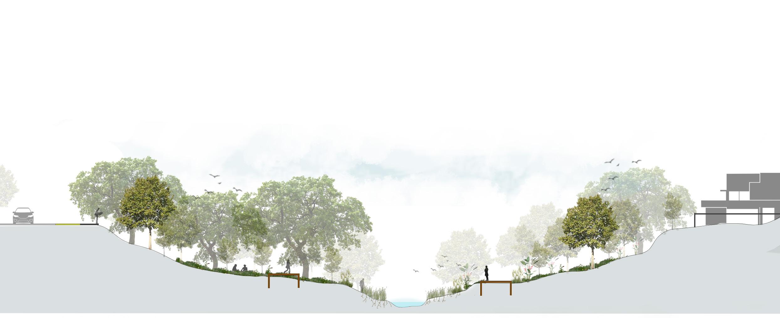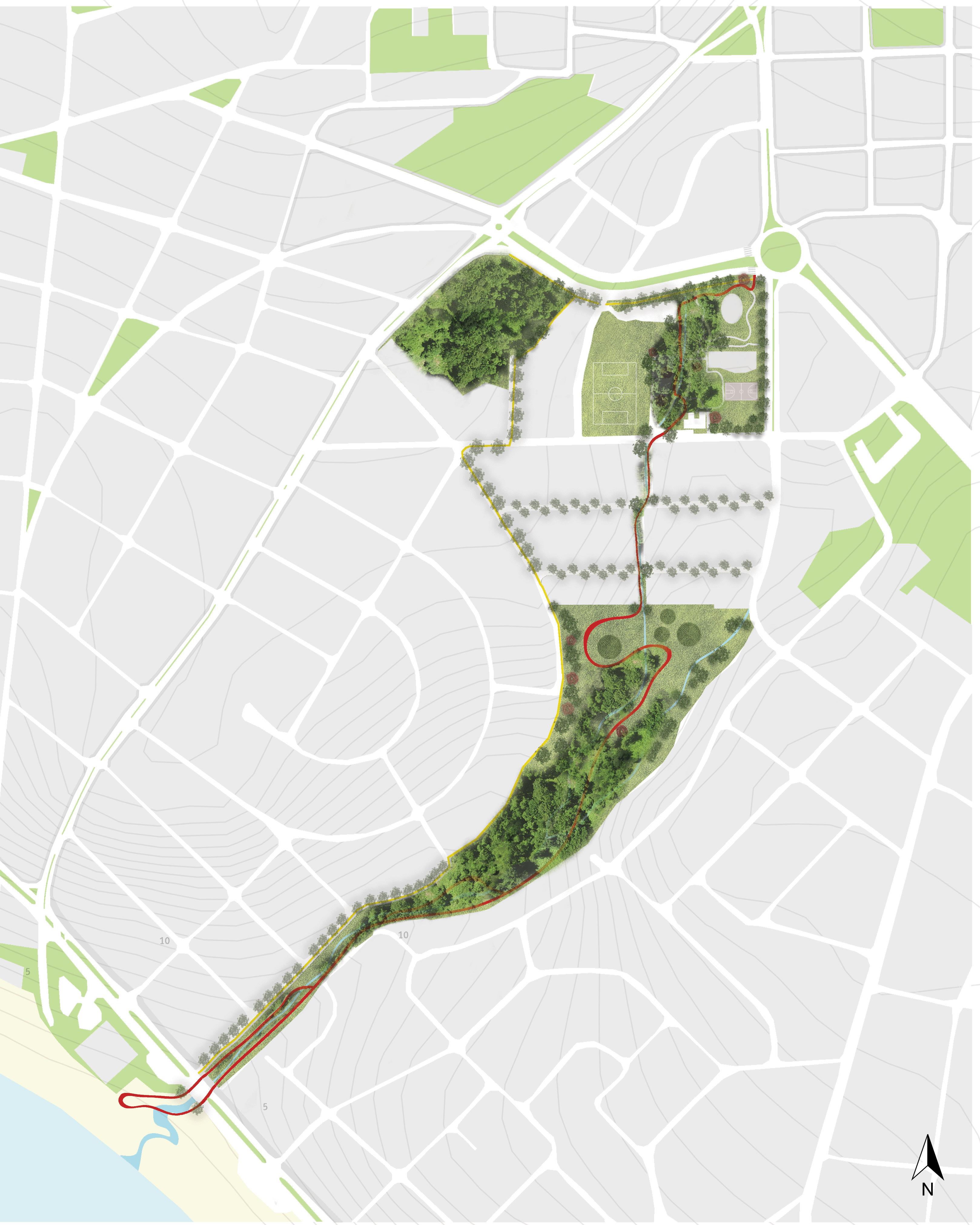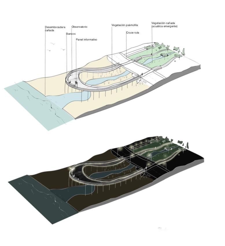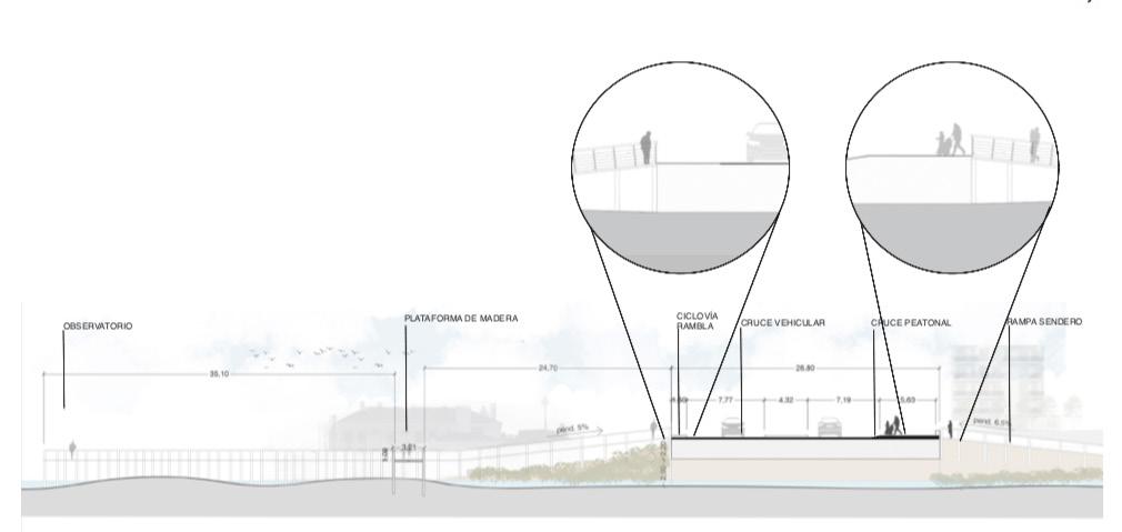 É aqui que se encontra a união do barranco de água doce com o mar salgado, e é em uma situação complexa devido à presença do curso de água e da estrada que difculta a travessia entre o parque e a praia e a conexão do barranco com o mar. Por esta razão é proposto neste setor destas duas unidades, fazer uma travessia que facilite a conectividade absoluta destas, permitindo que o caminho da água na boca alcance uma melhoria em sua qualidade, e uma travessia pedestre sobre a ponte que gere no usuário uma experiência segura e contemplação até chegar ao observatório na praia.