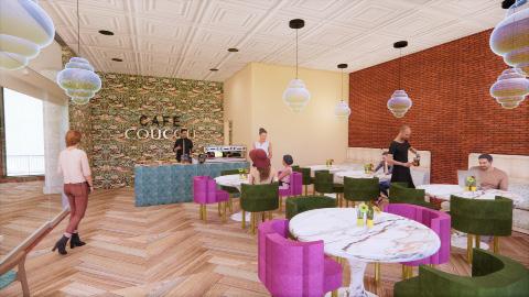 Map of Historic Districts and Landmarks in the Book Building Area Map of highest affected areas by gentrification in the cityFor Cafe Coucou, I wanted a very easy going system where one can grab a bite or a coffee and sit where they desired around the building. I included seating outside overlooking the courtyard and facing the Riverwalk. This mezzanine also allows access for guests to walk downstairs to the courtyard and exit straight to the Riverwalk or lounge in our courtyard or our bar. Essentially, food and drinks will be served in both the bar and the cafe so with the courtyard and the mezzanine included, there’s many great spots to sit and enjoy the view.