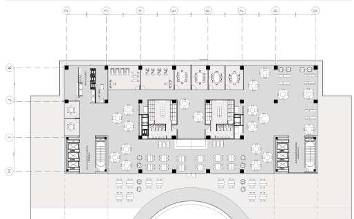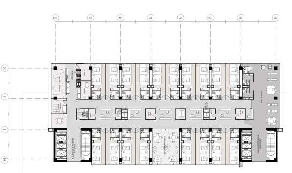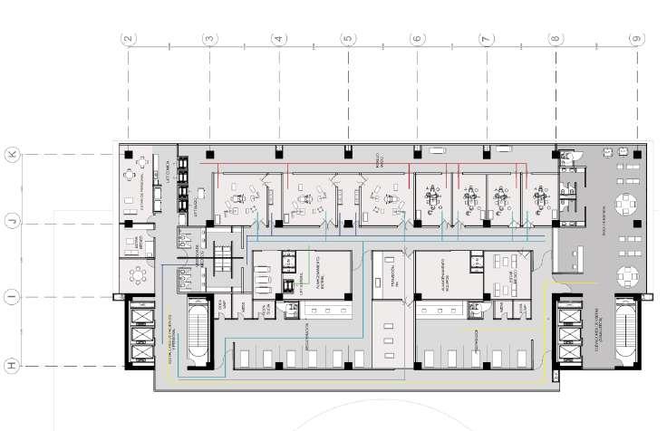 Las áreas en gris son para atención al cliente estan directamente relacionadas con las OP´S Oficinas Privadaas del fondo que son las de los socios que suelen atender reuniones. El área operativas cuenta con oficinas privadas para los abogados que estan directamente relacionadas con el área de asistencia. Las áreas de servicio atienden ambos sectores.